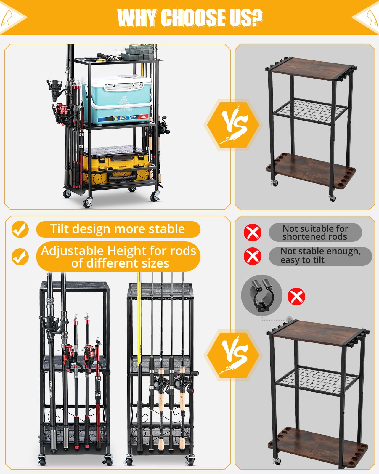 - Easy Assembly & Space-Saving: Experience hassle-free setup and save valuable space with our Fishing Pole Rack. With its small footprint and easy assembly process, you can have it up and running in just 20 minutes. Enjoy the convenience of mobility with casters and adjustable stand feet.