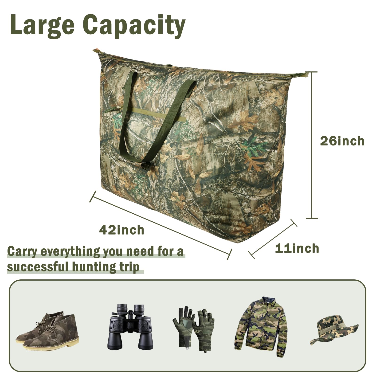 - 【Large Capacity】: The size of the scent proof bag is 42*22*11inch, which can accommodate your ghillie suit or leaf suit, camouflage net, hat, mask, hunting boots and other essential equipment. You can easily organize and carry everything you need for a successful hunting trip.
