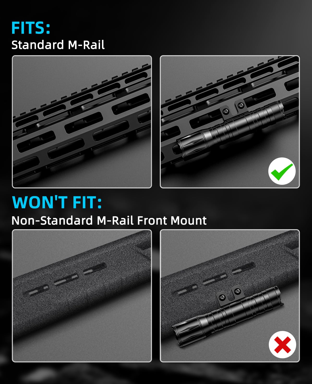 - Innovative installation design - This rifle light is compatible with Mlok rails. You can change the direction of the rail-mount base and choose 45 degree offset or 90 degree straight mounting, making the flashlight fit more closely to the rail without blocking your view.