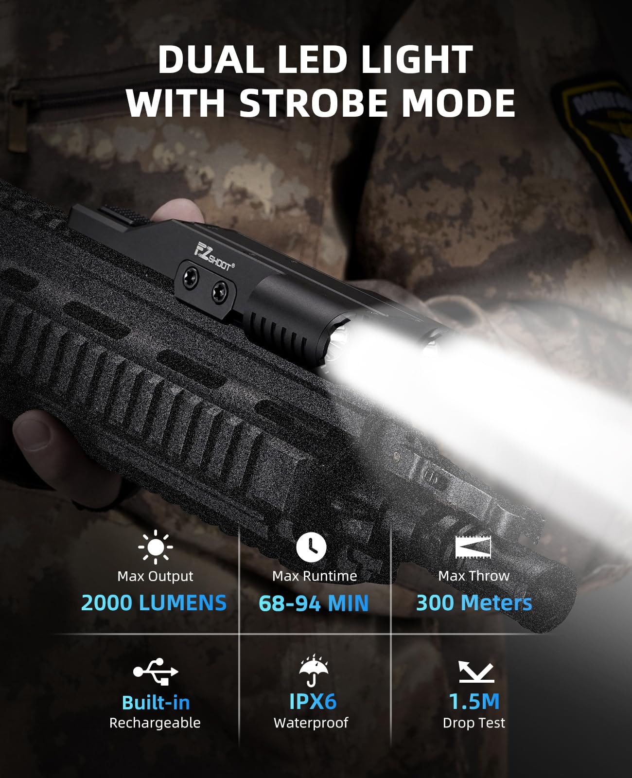 EZshoot 2000 Lumen Dual LED Rifle Light with USB Rechargeable, Rifle Flashlight Compatible with Picatinny Rail, Rechargeable Tactical Flashlight for Rifle with Strobe Mode