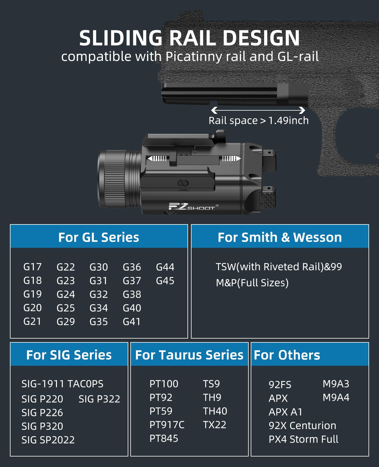 - Secure Mount Compatibility: Sliding rails design allow the pistol flashlight to be freely positioned in the best position, and it is compatible with most Glock rail (except GL43) and 21mm 1913 Picatinny rail.