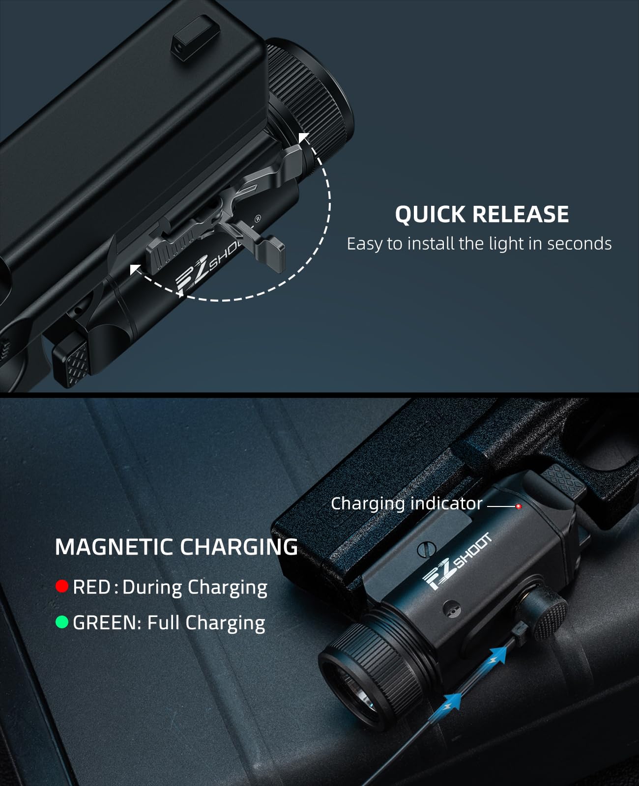 - Magnetic Charging: The gun light uses magnetic charging. It takes about 1.5 hours to fully charge, and the battery life is about 1.2 hours.