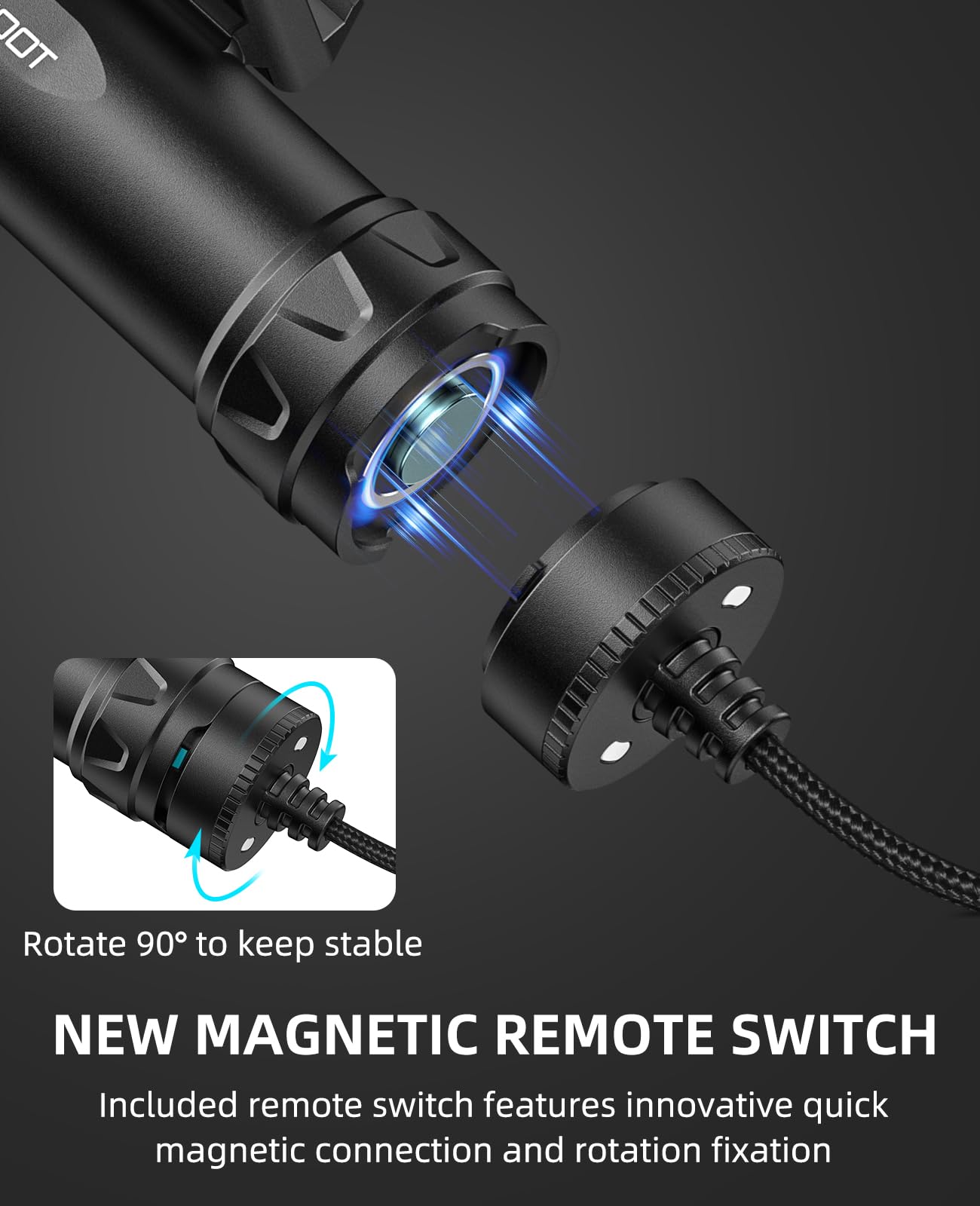 - Magnetic Switch: AR flashlight can be controlled with a switch on the tail or attached to a magnetic switch . Magnetic switch connection is easier to attach than a traditional remote switch( Rotate it 90°to fix it in place to prevent it from falling).The wire made of nylon is more flexible than traditional cable and is better suited to a variety of tactical styles.