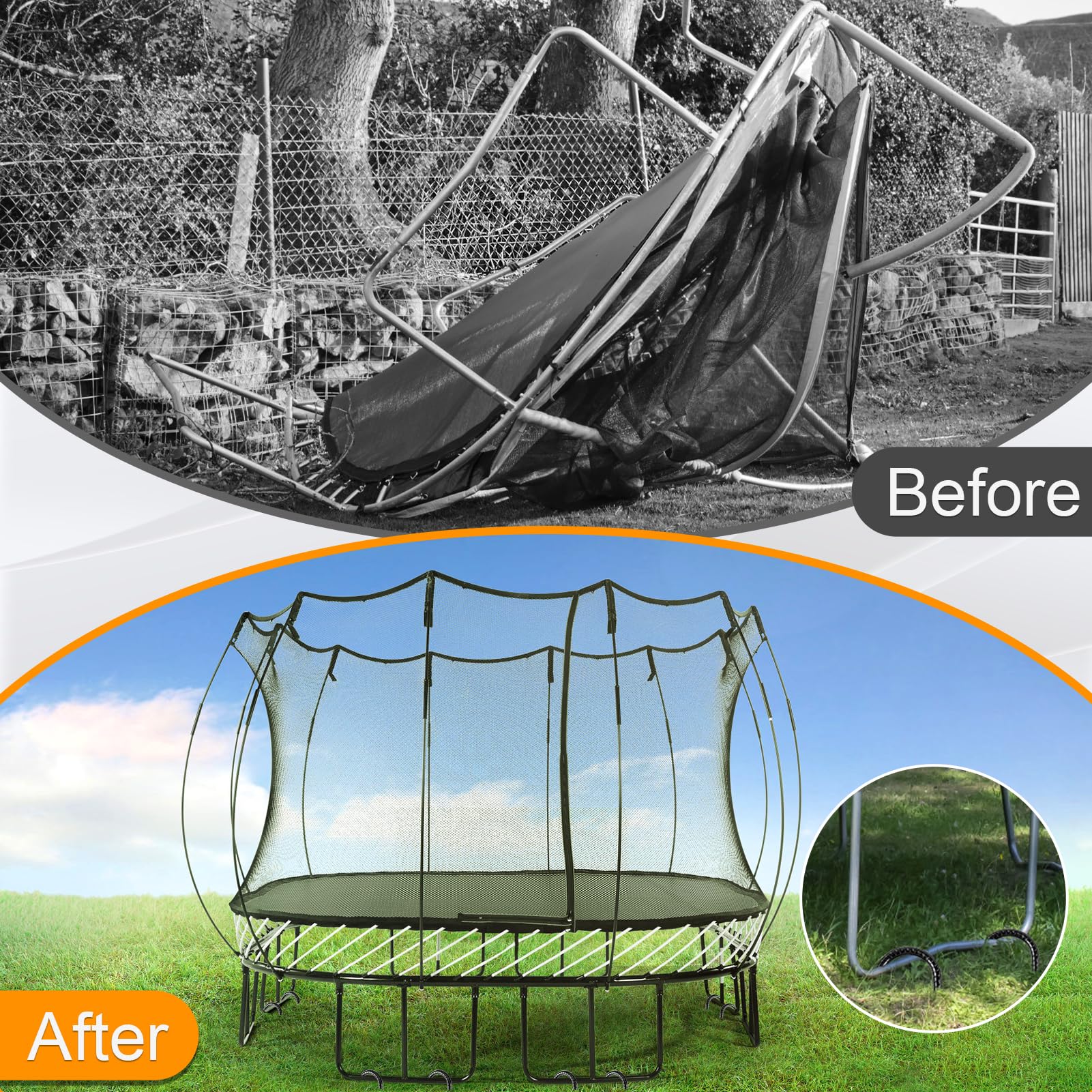 - Thoughtful Design: Rebar stake’s pointed tip allows easy penetration into the ground. The ribbed design improves soil grip. U hook firmly secures trampoline, enhancing stability and preventing shifting or tipping, especially in strong winds