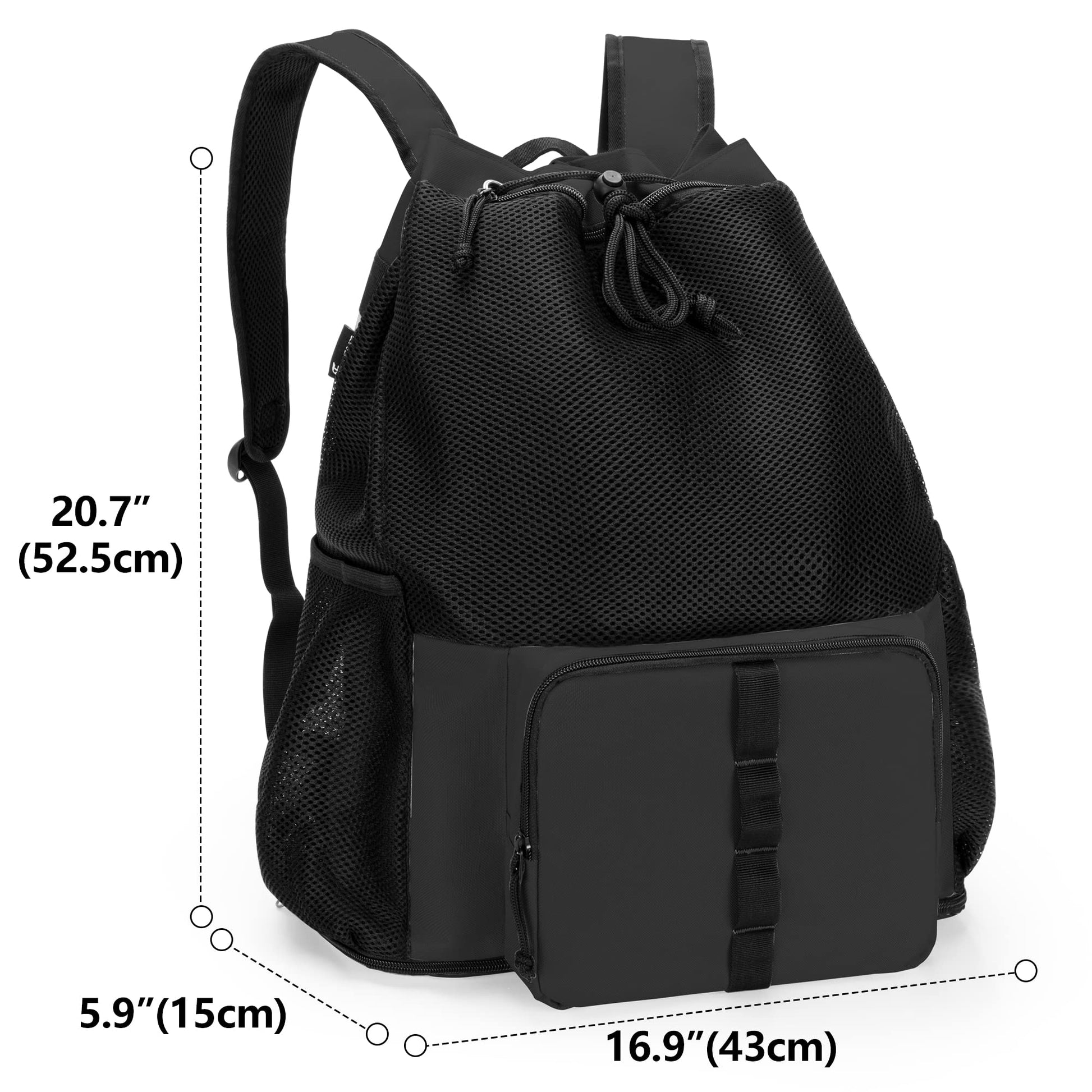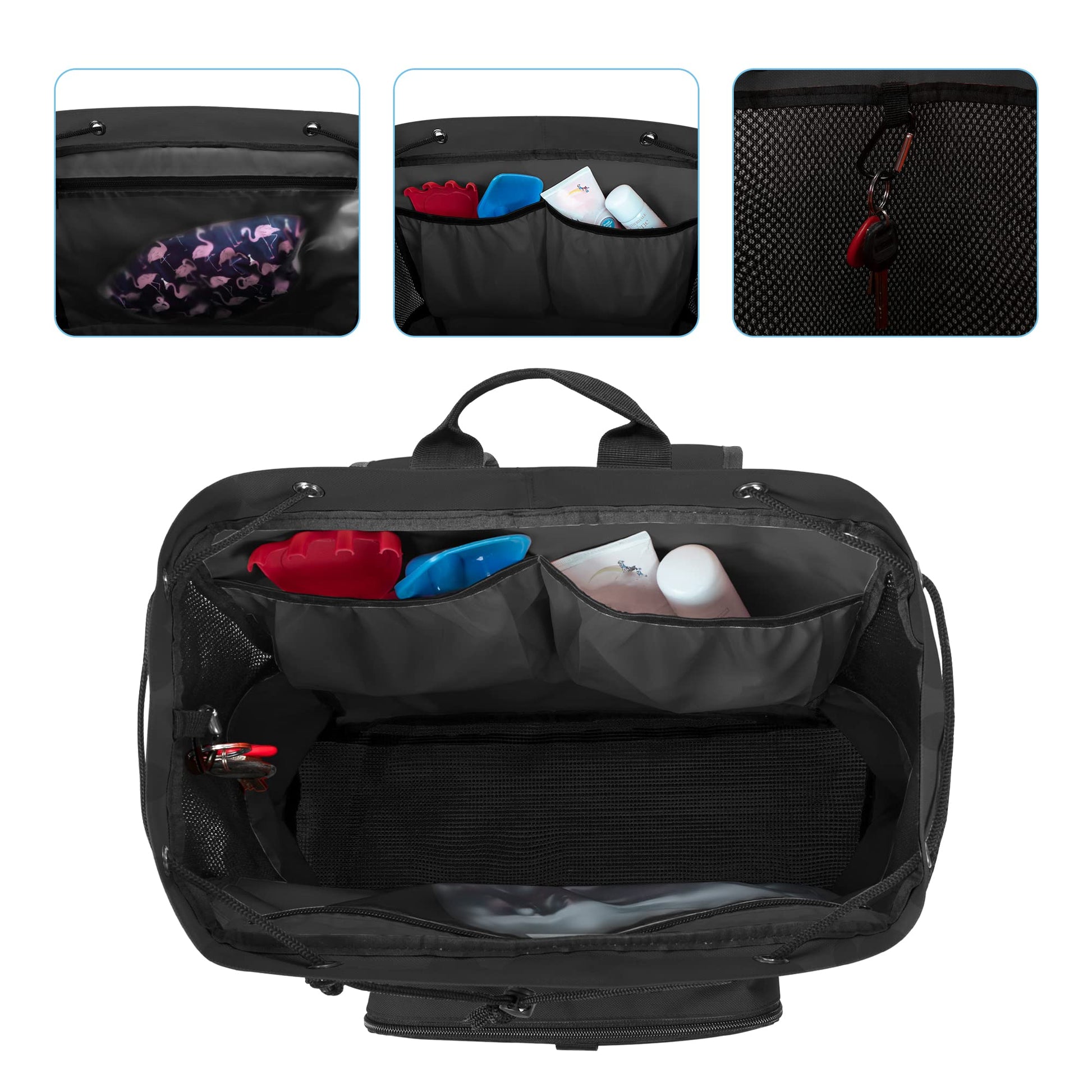 - MESH BEACH BACKPACK: Dimensions 16.9 x 5.9 x 20.7 inches. The mesh beach bag has spacious compartment with 2 pouches and built-in waterproof translucent pocket to separate the wet swimsuits from other gear. Front zipper compartment and 3 pockets outside for easy access sunscreen, water bottle and other beach essentials. (Empty bag only, NOT includes any accessories.)