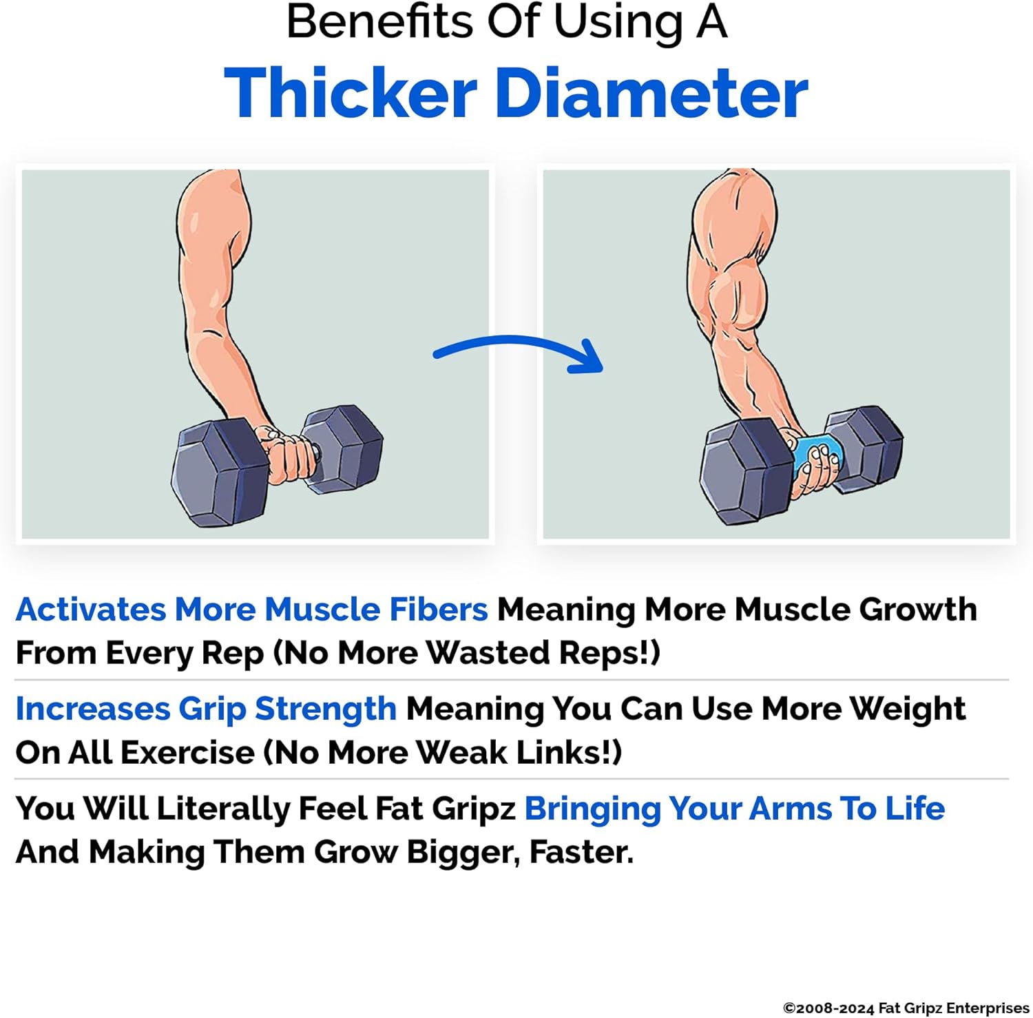 - BUILD ARM SIZE AND STRENGTH - Fat Grips will help you build bigger, stronger arms. They work by wrapping around barbells, dumbbells, cable attachments and exercise machine handles and increasing their diameter