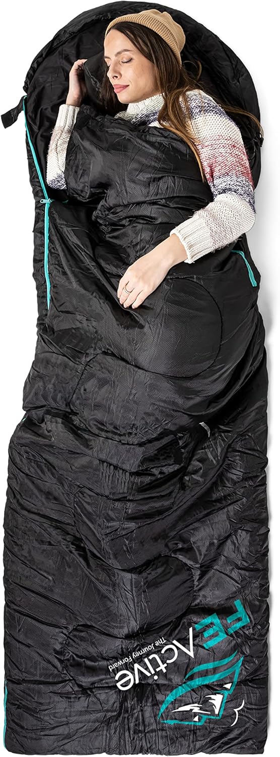 FE Active Camping Sleeping Bag - 3-4 Seasons Extra Long or Lightweight Hooded, Warm Outdoor Compact & Lightweight Sleeping Bag for Camping, Backpacking, Hiking, Travel | Designed in California, USA