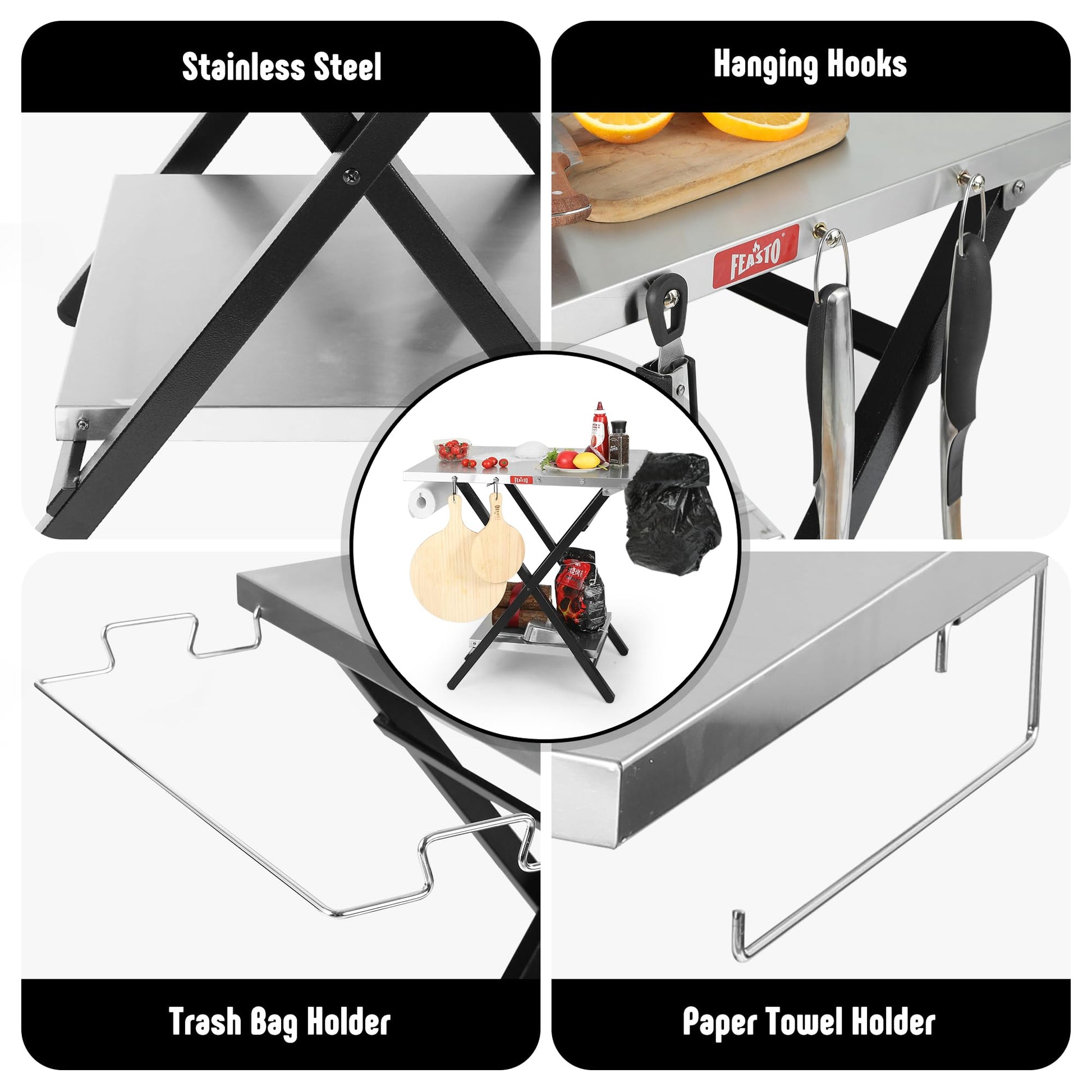 Feasto Outdoor Grill Table, Foldable Pizza Oven Stand & Griddle Stand with Garage Rack & Tissue Holder, Folding Outdoor Prep Table for Gathering and Party, 30" x 24", Stainless Steel