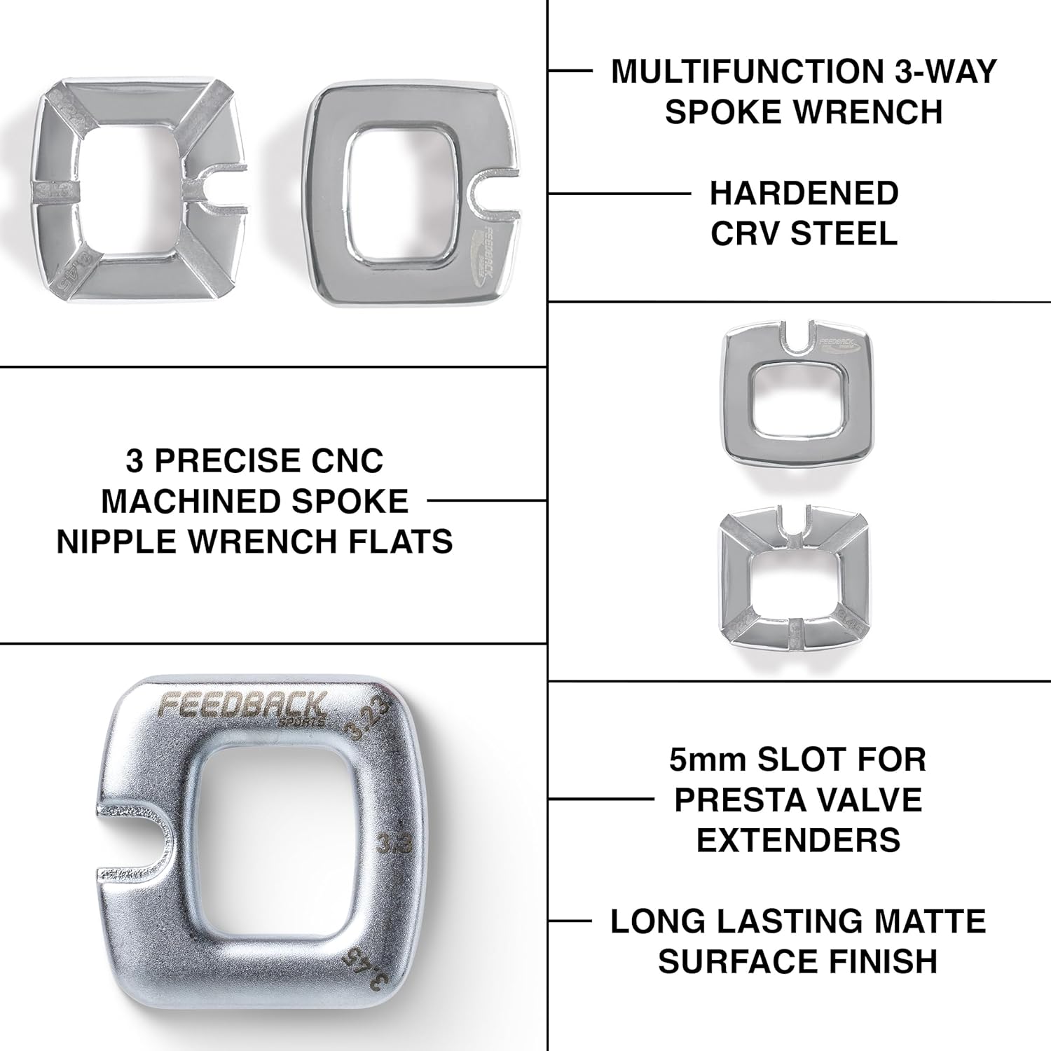 FEEDBACK SPORTS | 3-Way Bicycle Wheel Spoke Wrench | 4-In-1 Tool (3 Spoke Nipple tools & 1 Valve Extender) | For Bike Maintenance & Repair