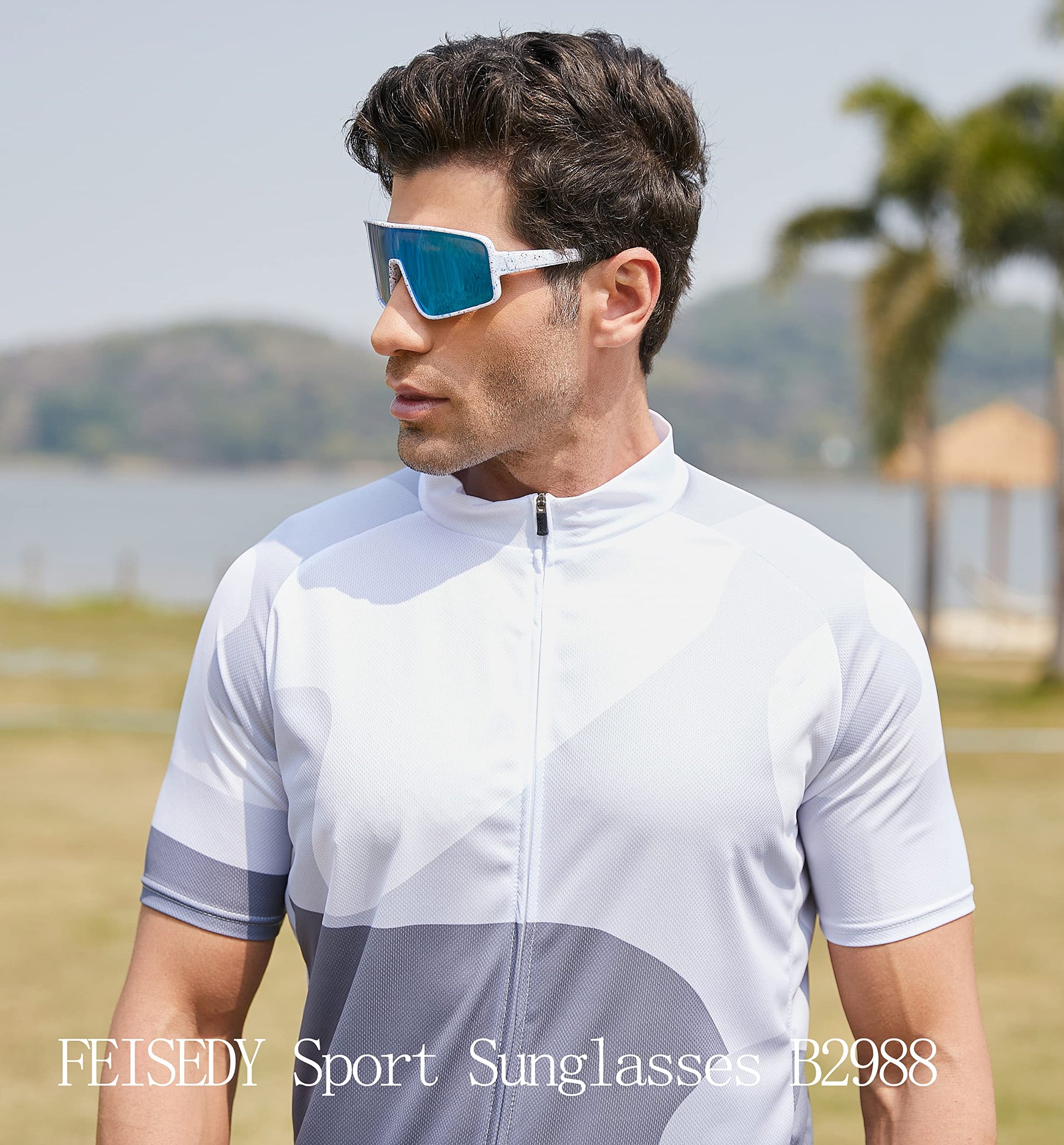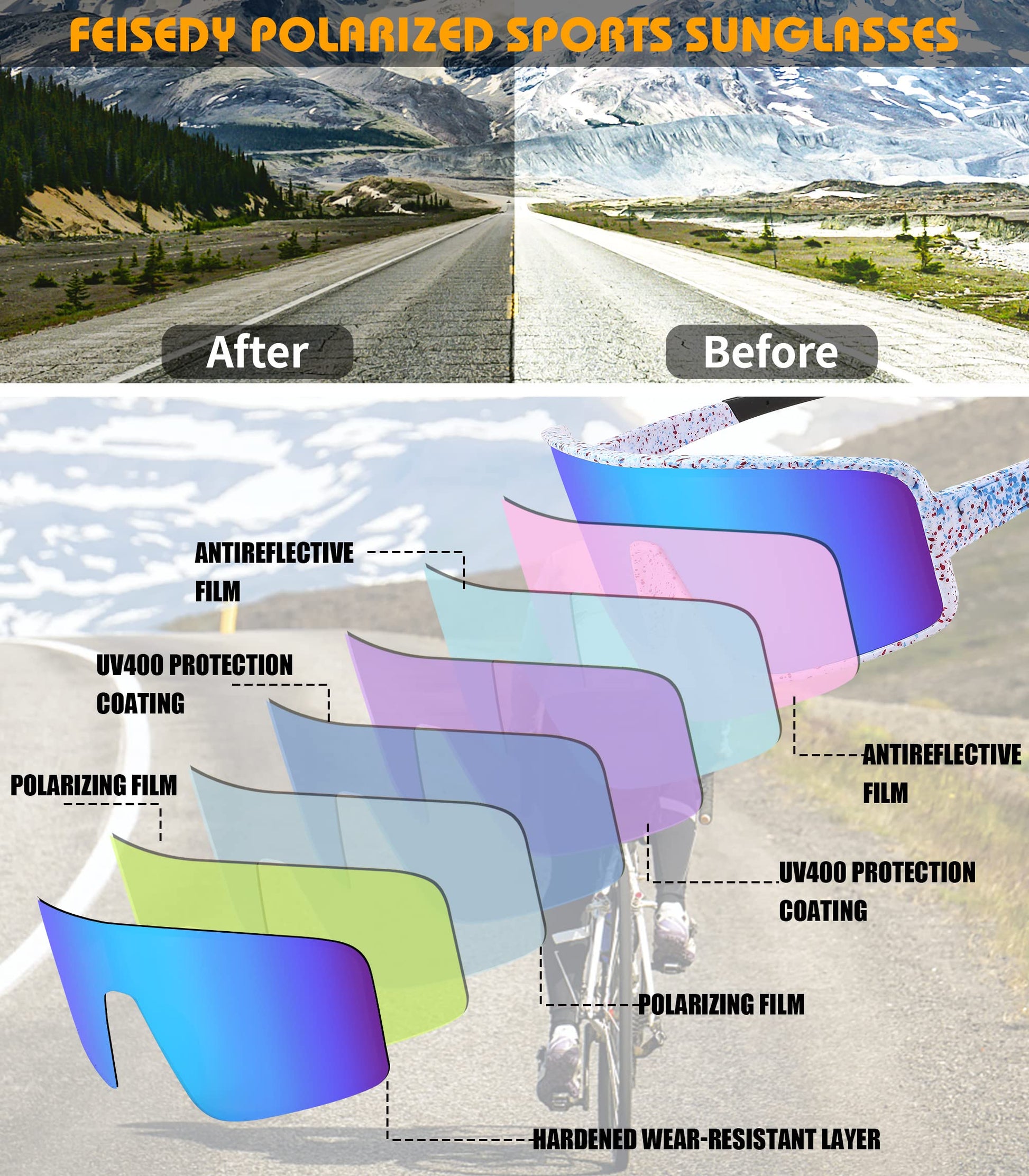 - Fashion Sports Sunglasses - FEISEDY sunglasses are not only a must-have fashion accessory, but also an important tool to protect your eyes. Those fashion sunglasses use a one-piece design and mirrored lenses to highlight the stylish design. The Wraparound sunglasses can well wrap your face and protect your eyees from harm, making you more comfortable and stylish in outdoor sports.