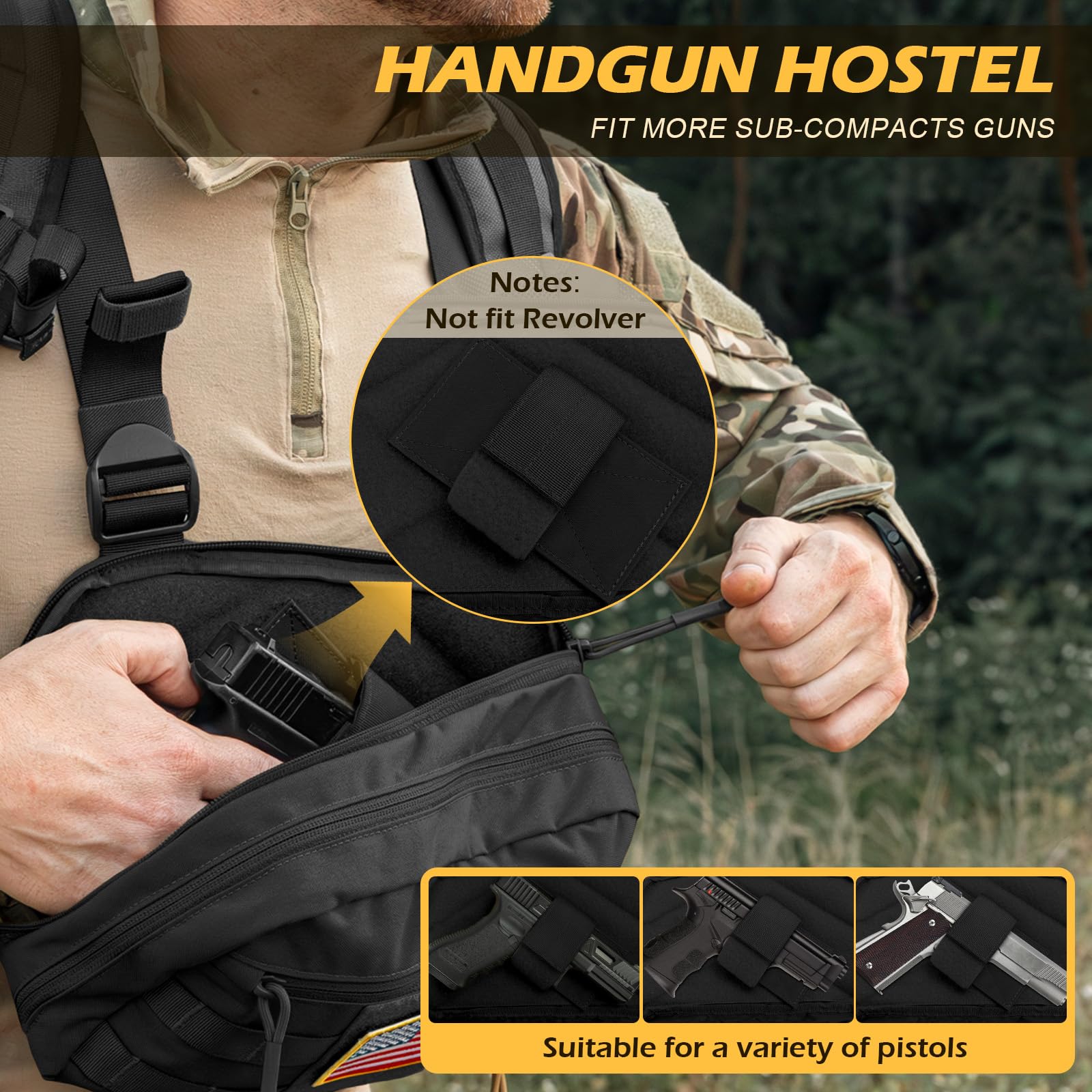 - 【Extra Concealed Nylon Pistol Holster】With this chest pack, you'll receive an adjustable nylon Hook-loop pistol holster, offering a secure spot for your handgun that can be swiftly accessed during emergencies. Please note that this holster is not suitable for revolvers.