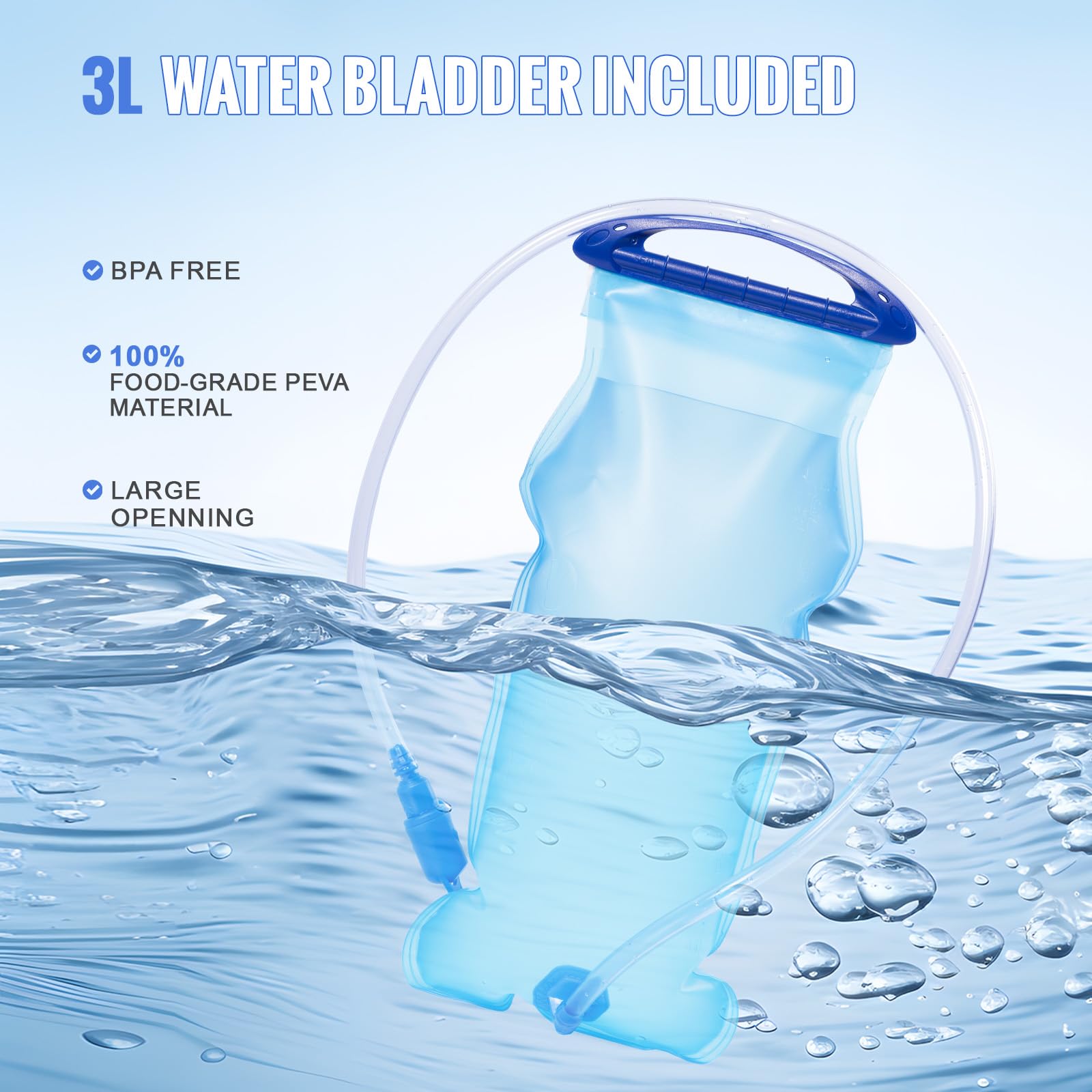 - 【INCLUDES 3L WATER BLADDER】 Equipped with a 3L water bladder to meet your hydration needs, it’s made from 100% food-grade PEVA material, has no odor or leakage, and is safe to use. The fully open top design allows for quick filling and easy cleaning, and added ice for a refreshing drink during cycling.