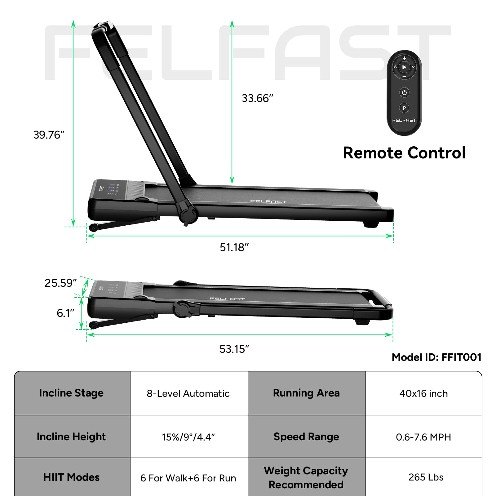 FelFast Walking Pad Treadmill with 15% 9° 8 Level Auto Incline, 2-in-1 Under Desk Foldable w/Remote Control, 12 HIIT Mode, 265 Lbs Max, 7.6 MPH Max, Portable Mini Treadmill for Office Home
