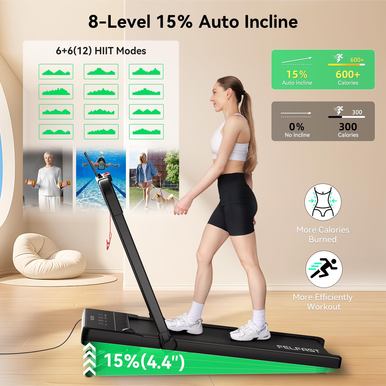 - Auto Incline Treadmill - Compared with traditional 2-in-1 treadmills, this FelFast under desk treadmill is updated with a 0-15% 9° 8-level auto incline function. Press one button, and automatically adjust the incline level. You can enjoy hiking and mountain climbing at home on rainy or foggy days. It helps burn calories 3 times more and helps you keep fit more efficiently and quickly.