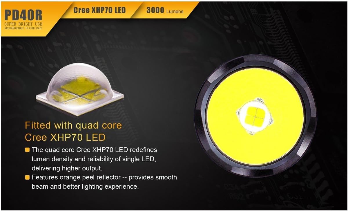 The Fenix PD40R is a very powerful flashlight that uses a larger 26650 battery for longer battery life! This super bright FenixPD40R is now USB rechargeable. Fitted with a CREE XHP70 LED, it is powered by a Fenix ARB-L26-4500P Power battery, which activates the maximum output of 3000lumens and extends the run-time dramatically. It is also powered by a standard 26650 Li-ion rechargeable power battery which will operate at the high mode of 1000 lumens. In addition, the flashlight features digitally regulated output and IP68 classification, plus this compact flashlight also offers a comfortable grip. General lighting modes and strobe are independently controlled by the two switches. It will be your trusted companion.