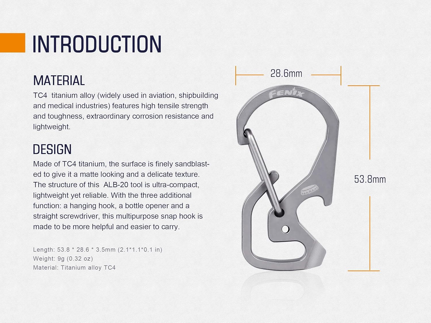 The Fenix ALB-20 clip is made of TC4 titanium alloy for high tensile strength and toughness, extraordinary corrosion resistance and light weight. The surface is finely sandblasted to give it a delicate matte look and texture. ALB-20 features a hanging hook, a bottle opener and a simple flat screwdriver all in one compact unit.
