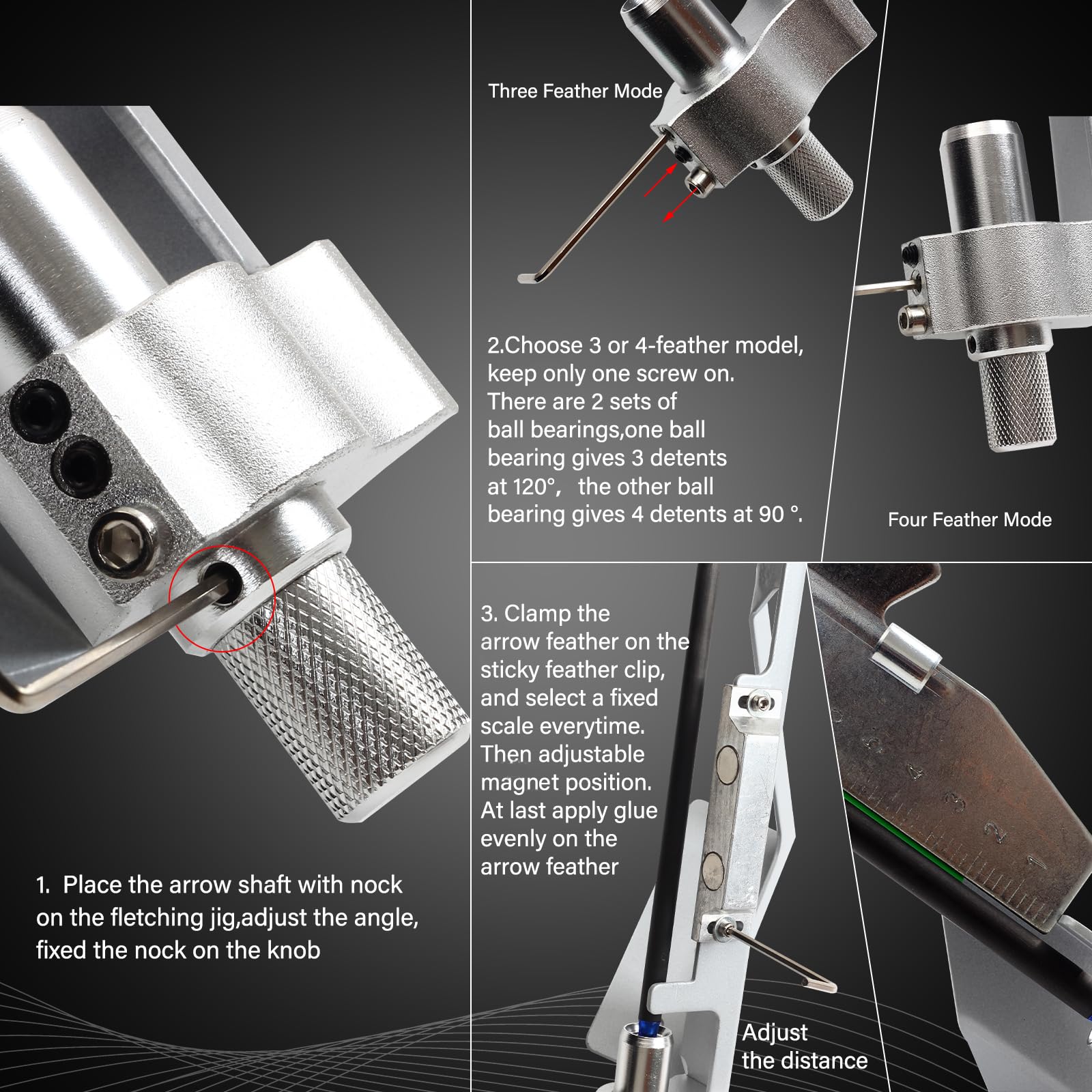 - 🏹Magnetic clamp design, easy to operate, and quick to set. Adjustable design, you can set it to either 3-feather mode or 4-feather mode to easily adjust the arrow feather angle
