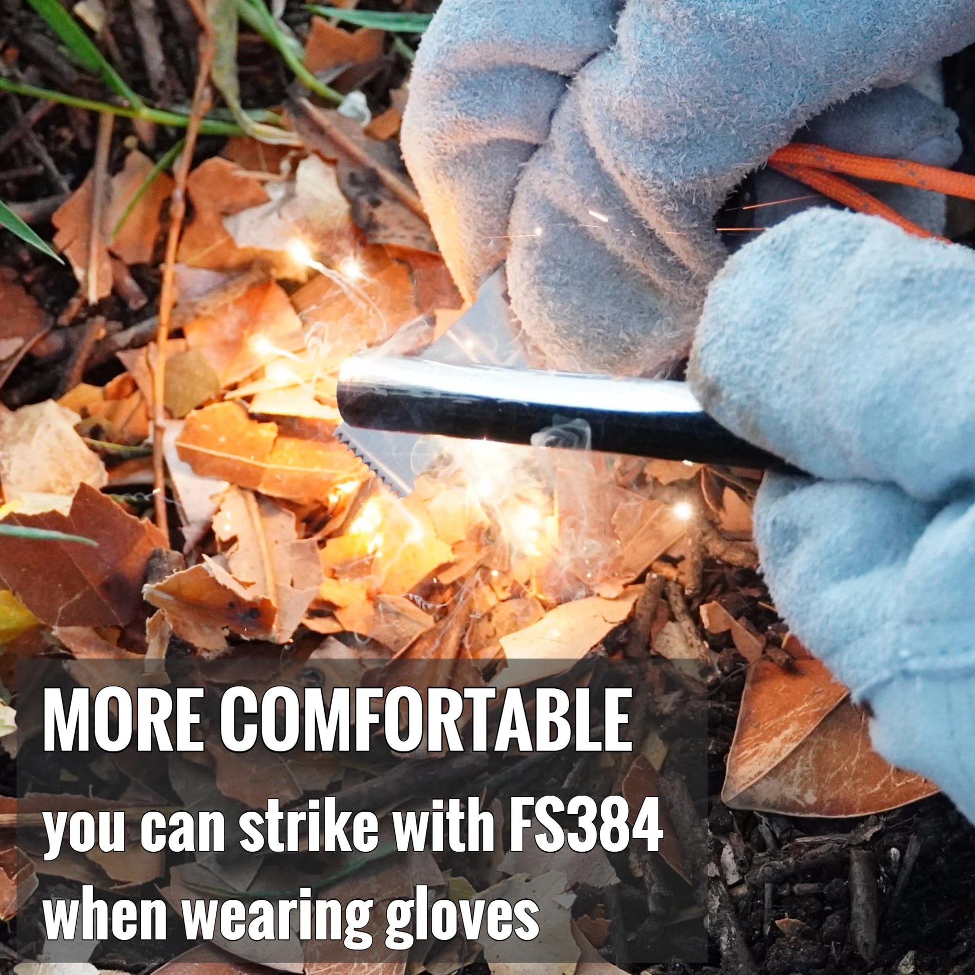 - COMPONENTS INCLUDED - FERROFIRE FS384 ferro rod camping fire starter has a 3/8 inch thick x 4 inch long premium ferrocerium rod, unique designed sharp and safe four-striking-edge striker, reflective orange 550 paracord lanyard handle.