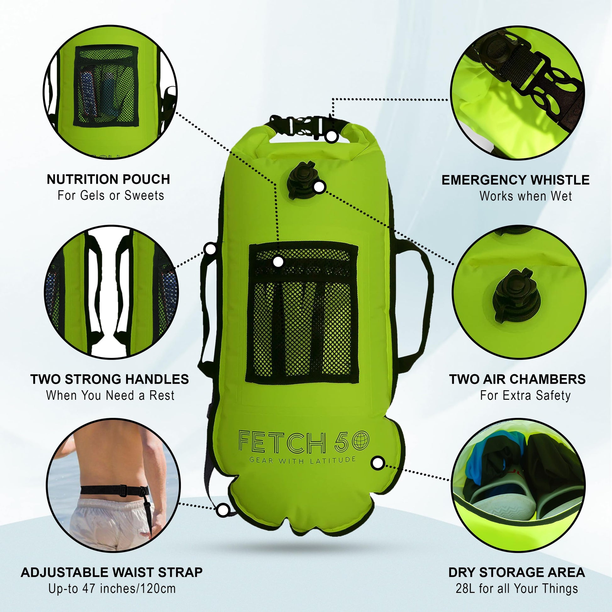 Fetch 50 Swim Buoy Dry Bag | Double Chamber Dry Bag with Handles, Nutrition Pouch and Whistle | Flourcesent Yellow Swimming Tow Float