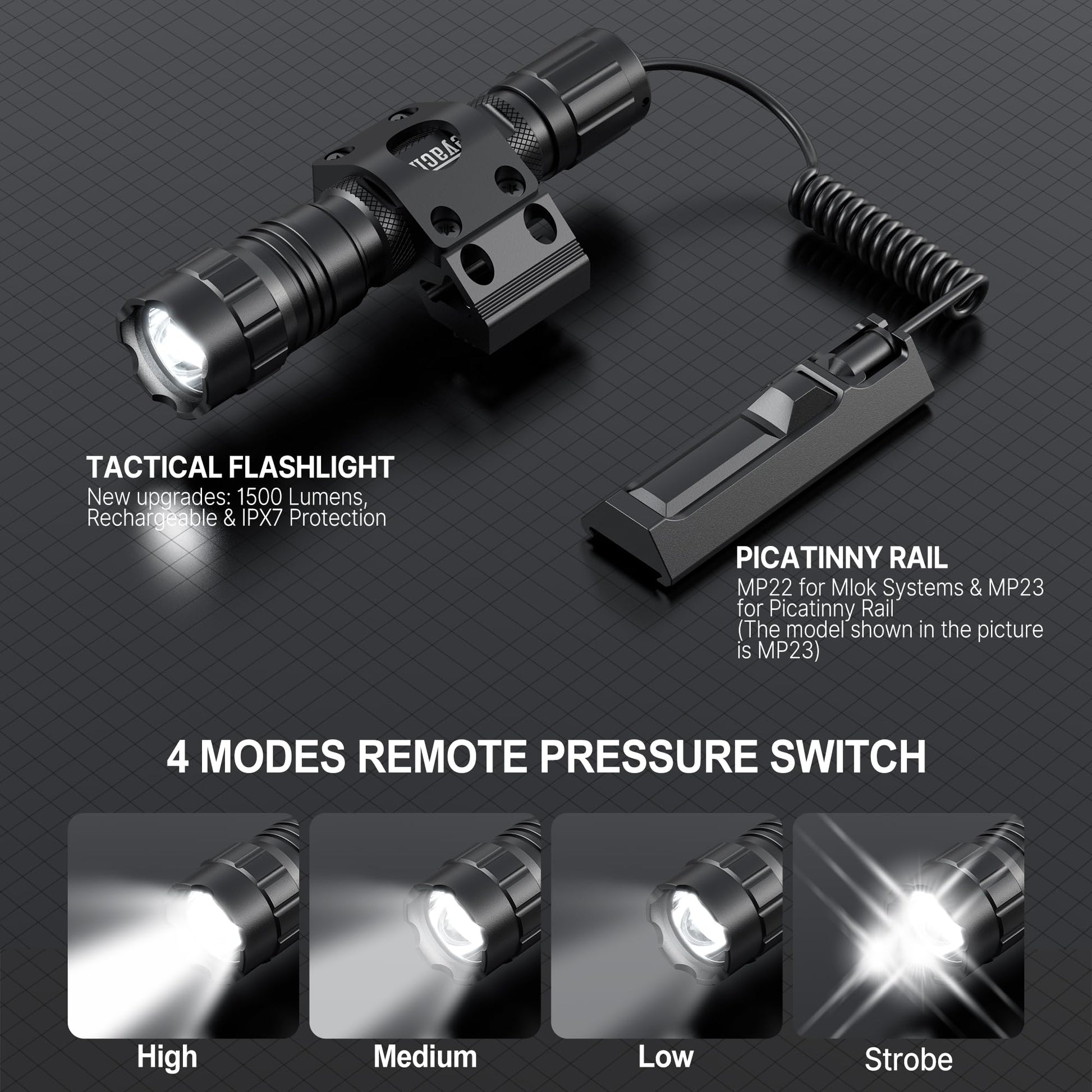 - Universal Compatibility: Our m lock flashlight equipped with the M Lock offset mount for secure rail attachment, plus two pressure switch mounts (Picatinny & M Lock) for remote activation. Enhance versatility and convenience for any tactical scenario