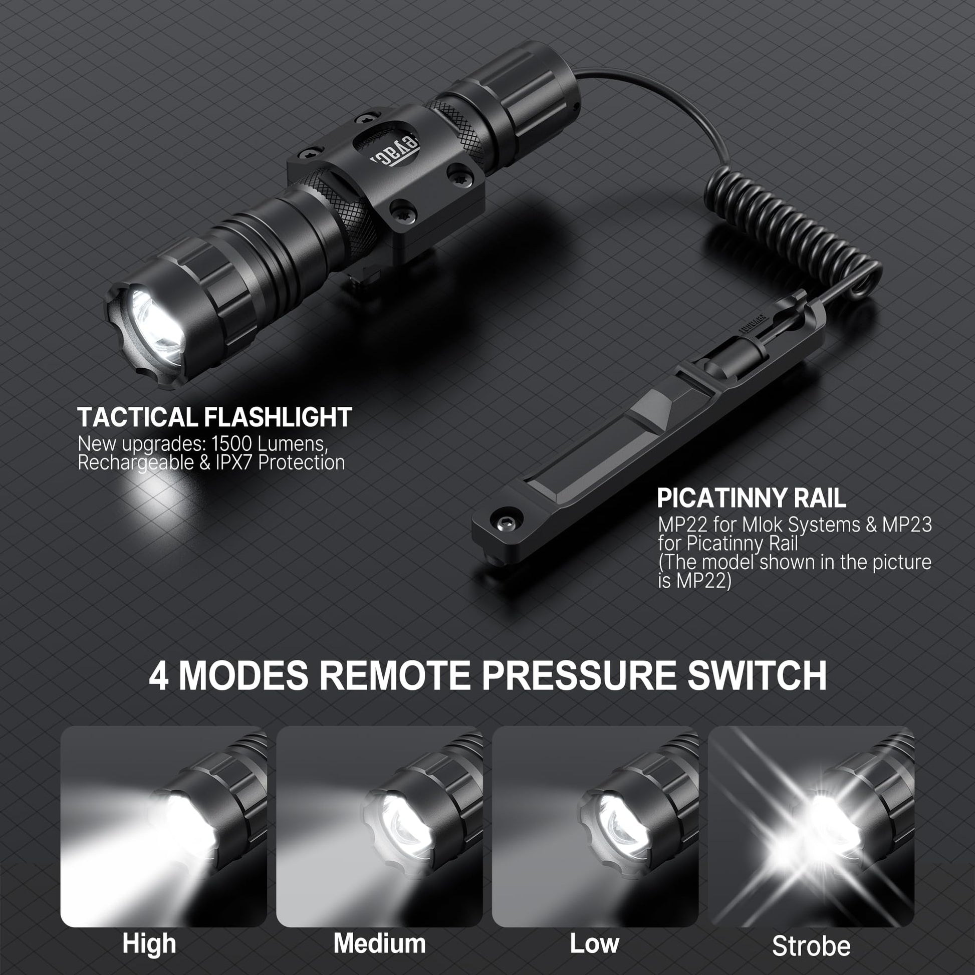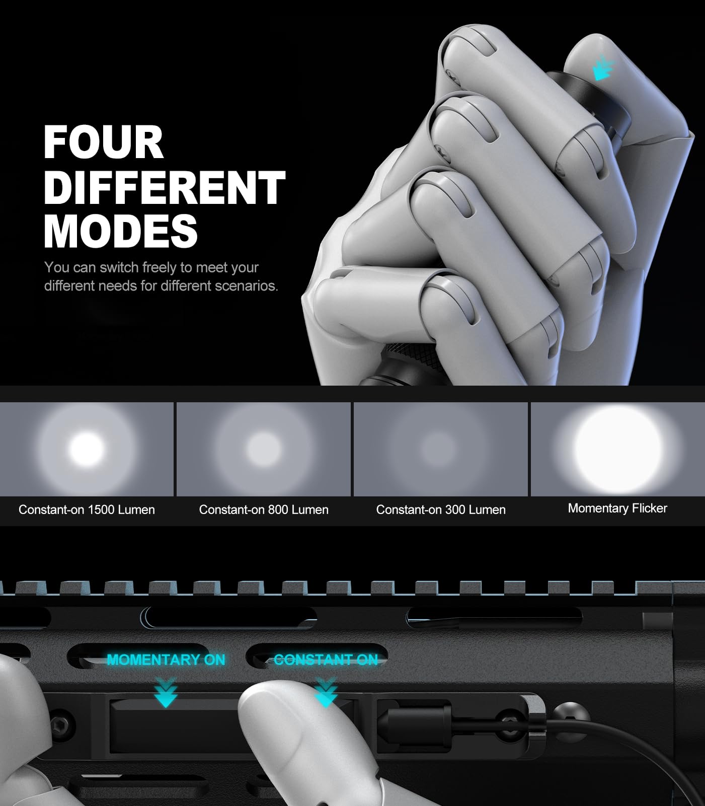 - Universal Compatibility: Includes the M-Lock mount and Picatinny/M-Lock pressure switch mounts for secure attachment to rails. The tail-cap pressure switch and offset mount ensure effortless operation