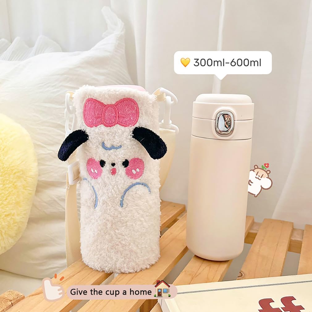 FHARLXQ Cute Water Bottle Sleeve Insulated Water Bottle Cover for Stainless Steel/Glass/Plastic Bottles (White Cute Plush Dog)