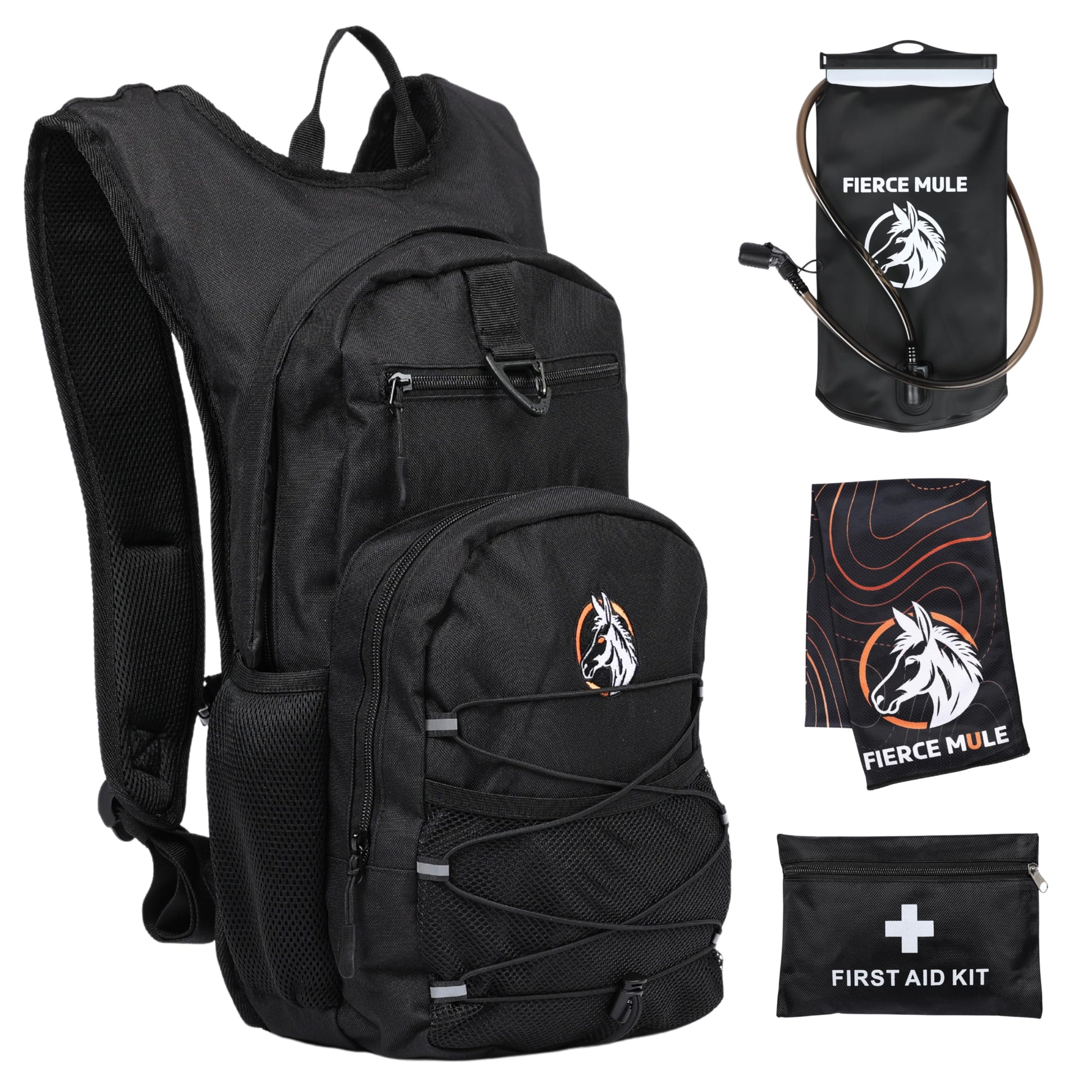 Fierce Mule Hydration Backpack 18L with First Aid Kit, 3L Water Bladder & Cooling Towel - Lightweight Hydration Daypack for Biking, Running, Hiking, Camping, Raves