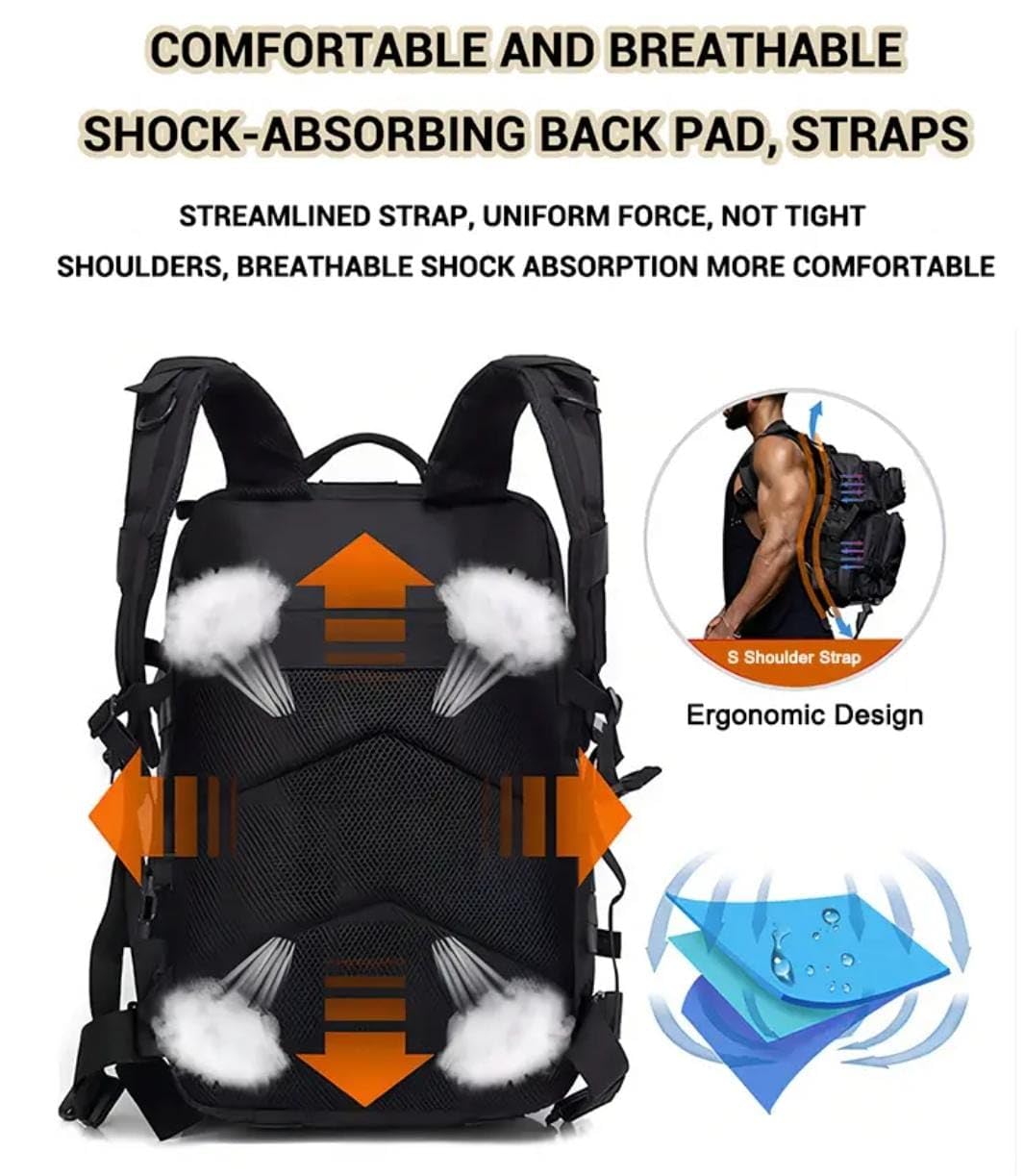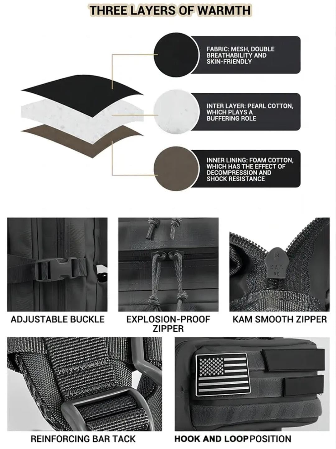 Your Go-To Gear for All Adventures! ❤️DURABILITY You Can Trust: Crafted from high-quality, water-resistant 900D polyester, this backpack is built to withstand the harshest conditions, ensuring your gear stays protected, rain or shine. ❤️SPACIOUS AND ORGANIZED: With a large 45L capacity and multiple compartments, pockets, and mesh pouches, you can easily organize your essentials for quick access. Perfect for 3-day trips, hiking, camping, or any tactical mission. ❤️MOLLE System Compatibility: Fully equipped with MOLLE webbing on the front and sides, allowing you to attach additional pouches and gear for customizable storage solutions. ❤️COMFORT AND SUPPORT: Features padded shoulder straps, adjustable chest and waist belts, and a breathable back panel to provide maximum comfort and support during extended wear. ❤️VERSATILE AND MULTIFUNCTION: This backpack isn't just for tactical use—it's also ideal work, travel, or outdoor activities. Its sleek design makes it suitable for both professional and casual settings. ❤️ADJUSTABLE STRAPS : Easy adjustable waist straps to keep the waist strap from sliding loose through the buckles ,For comfort and a secure fit during movement. Why Choose Our Tactical Backpack? ❤️Built to Last: Engineered for durability and reliability in any situation. ❤️Organized Storage: Keep your gear neatly organized and accessible. ❤️Comfortable: Ergonomically designed to ensure comfort and support. Whether you’re heading out for a weekend camping trip, a tactical mission, or just need a reliable everyday backpack, our Ultimate Tactical Backpack is your best companion. Gear up and stay prepared with the best in tactical gear!