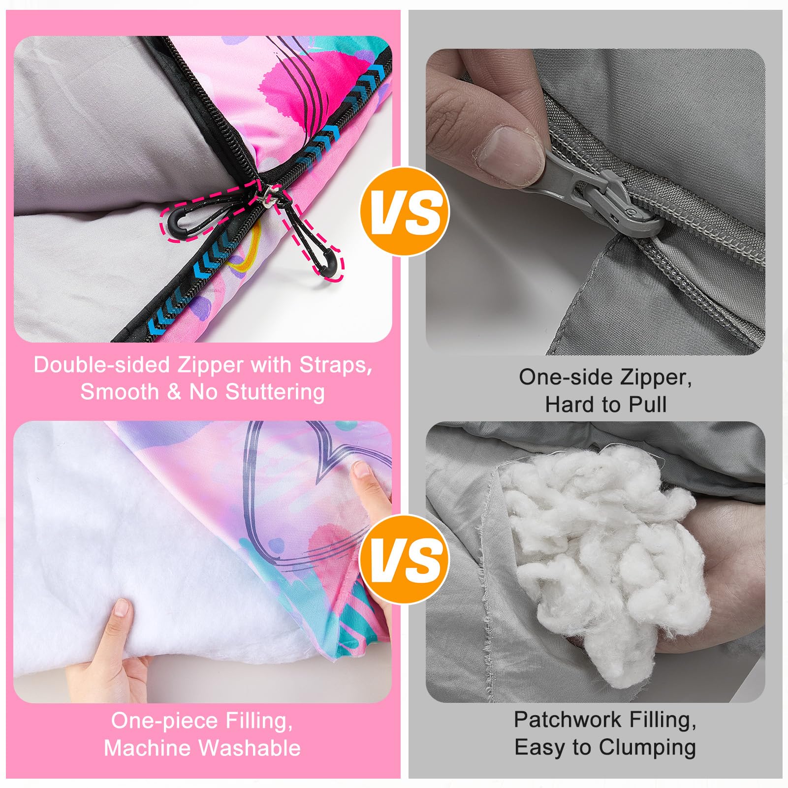 - 3D Bottom Structure: This sleeping bag for kids provides enough space for children's feet to avoid pressure and ensure comfort , and prevents the sleeping bag from being easily kicked off by the little child during use; The zipper features anti-snag and double-sided design, allows smooth operation from both inside and outside, so there is no need to stretch hands out of the sleeping bag