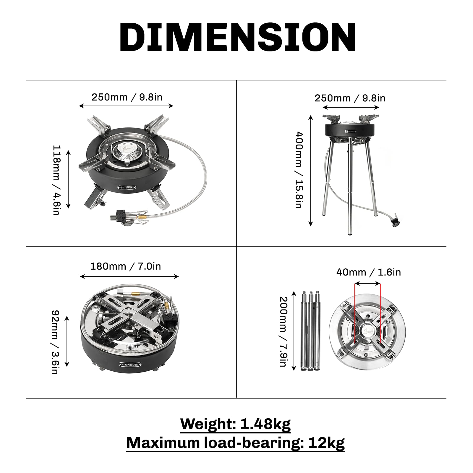 - Dual Preheating Tubes for Consistent Flame: Features an inverted gas canister design with dual preheating tubes, ensuring a stable flame even in cold weather or low gas pressure conditions, eliminating fuel waste.
