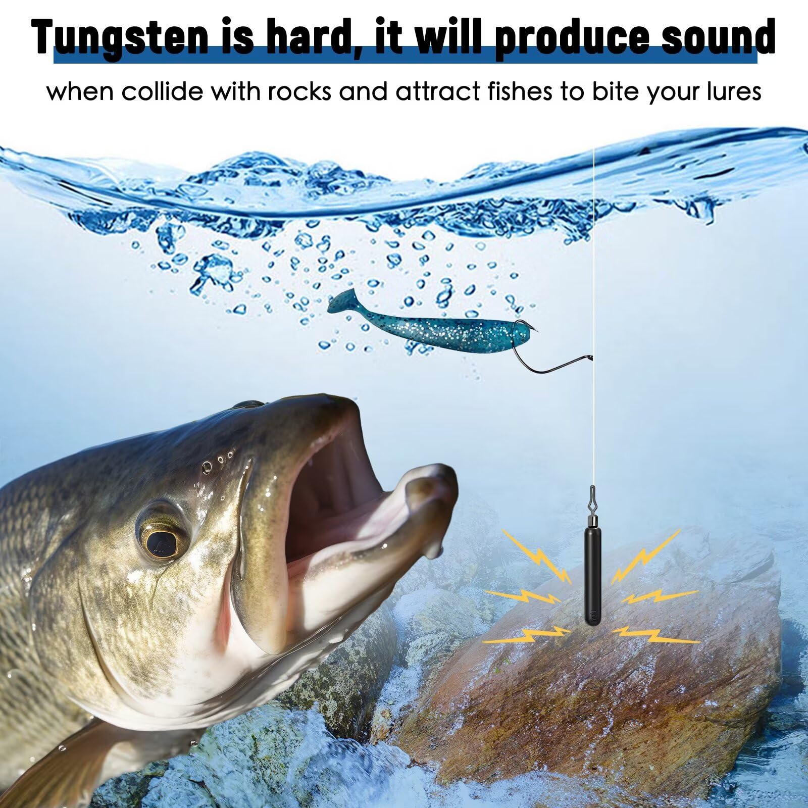 - Less Snags - The thin shape high density of Fishfun tungsten cylinder sinkers gives you greater choices over where you can fish; The streamlined design of these drop shot sinkers have been engineered to easily slide free from rocks, weeds and submerged logs.