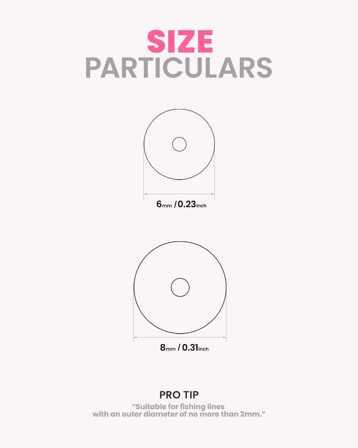 - Technical Specs - Available in 2 popular sizes with outer diameters of 6mm (0.23 inch), 8mm (0.31 inch).A set contains about 100 6mm size beads and about 50 8mm size beads.Fits fishing lines up to 2mm in diameter.