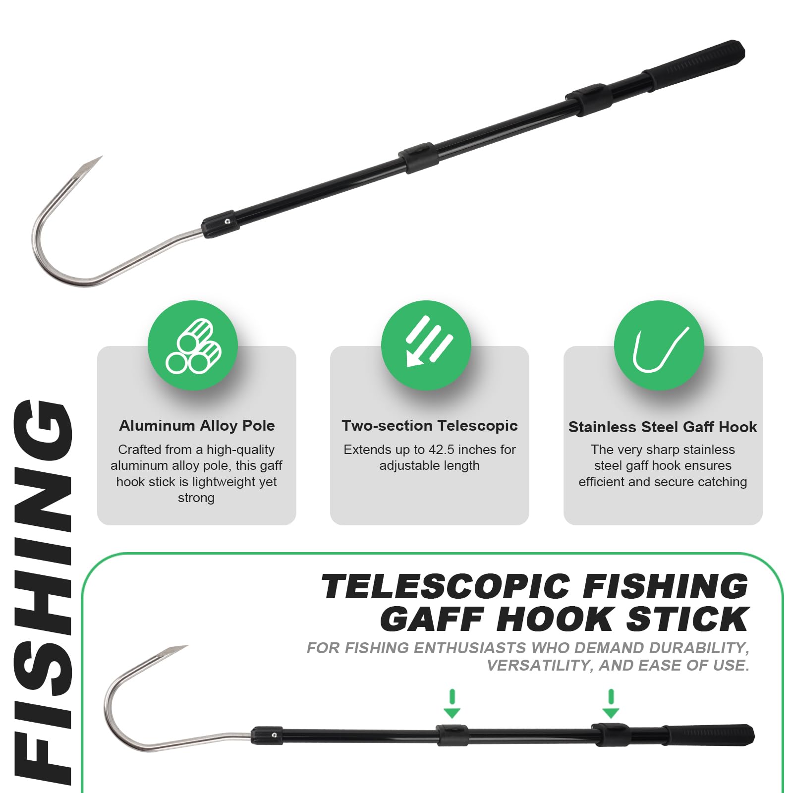 - he pole of the Fishing Gaff is crafted from lightweight yet sturdy aluminum alloy and features a sleek black finish for added durability. Its telescopic design allows it to extend from a compact size to full length. The dual clamp system ensures a secure lock and easy release, providing stability and quick adjustments during use.