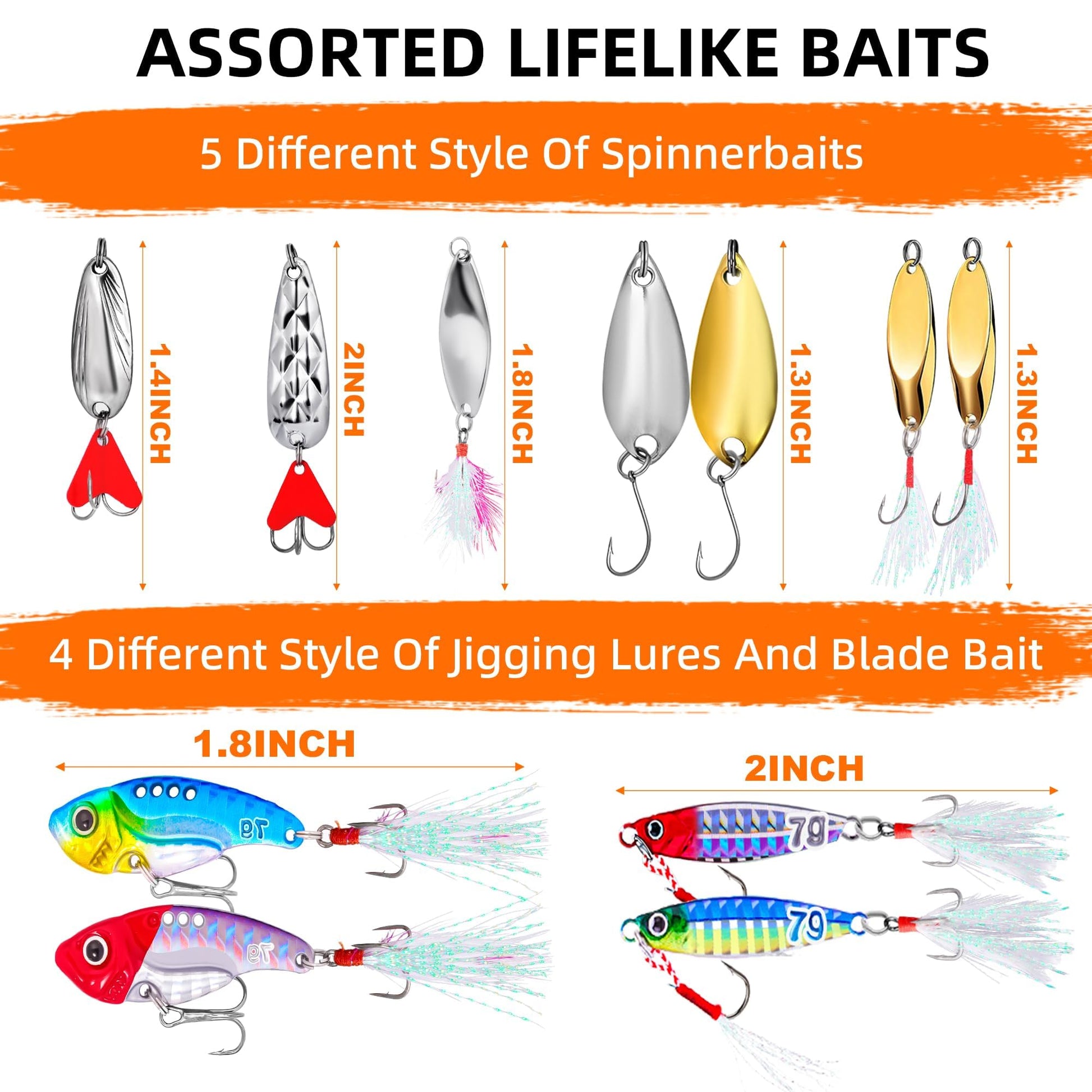 - Ultimate Father's Day Gifts: Surprise your loved father or husband with the all-in-one fishing kit gift! Carefully selected various types of options, including lures (Crankbaits, Popper, Spoon,VIB), different styles of hooks (offset hooks, wacky hooks, treble hooks, etc.), soft plastic, sturdy free tackle box, skill card, tape measure, swivels and other accessories. Reliable quality and complete variety, can be a reliable option for any angler in any water