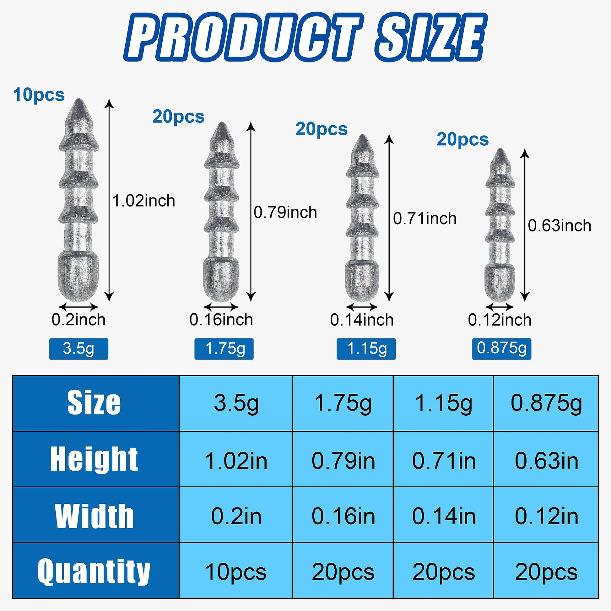 - PACKAGE: Fishing nail weights tackle kit includes 4sizes: 0.875g-20pcs, 1.15g-20pcs, 1.75g-20pcs, 3.5g-10pcs; enough quantity and various sizes satisfy your various usages.