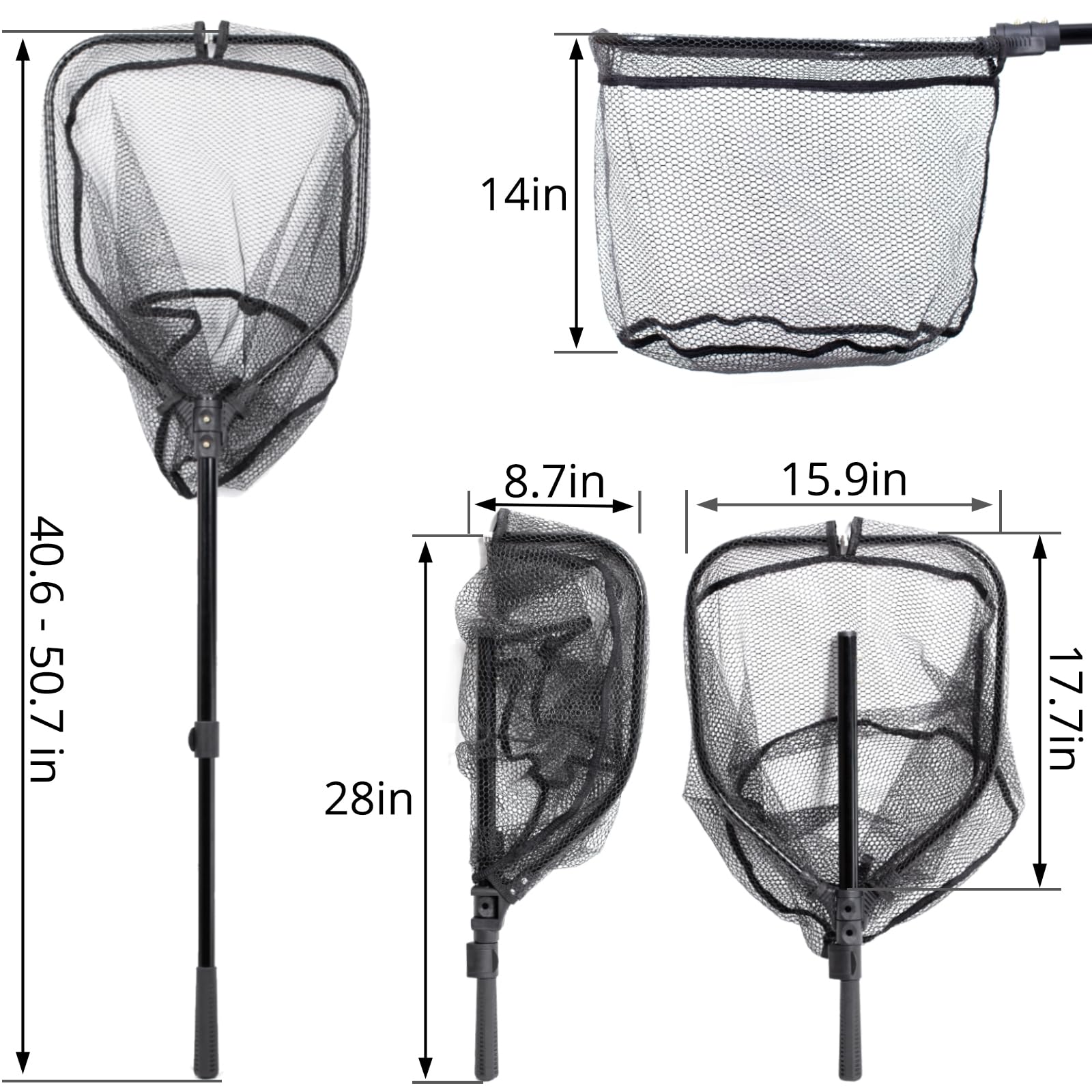 - 📏 Adjustable & Extendable Handle: Our landing net handle can be easily extended and retracted between 40.6 and 50.7 inches with the buckle design, allowing you to customize the length as you need. The two-section telescopic design ensures a firm, ergonomic grip and better control when you’re reaching into the water to secure your catch, no matter the conditions.