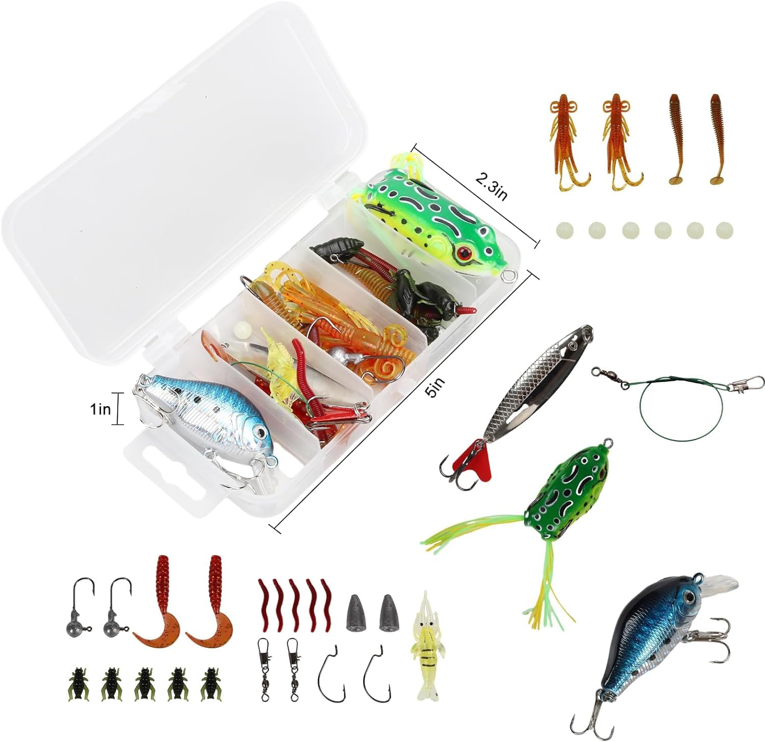- 【Fully Loaded Tackle Box】The 35 pieces fishing baits set comes with everything you need: 1 Frog Lures,1 Crankbait VIB,1 Spoon Lures, 6 Earthworm, 2 Curved tail grubs, 2 Paddle Tail Swimbaits, 2 Rolling Swivel Snap, 2 Barrel Snap Swivel, 2 Off Set Hooks, 2 Tube Jigs, 5 Fishing Beads, 3 Shrimp and 5 Cricke