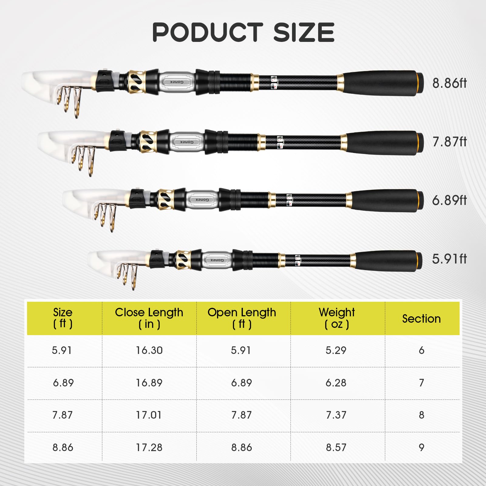 - Multiple Accessories: This fishing poles kit includes: 1*telescopic fishing rod+ 1*fishing reel+ 1*EVA carrier bag+ 1*120m fishing line+ 1*tackle of fishing lures & accessories.