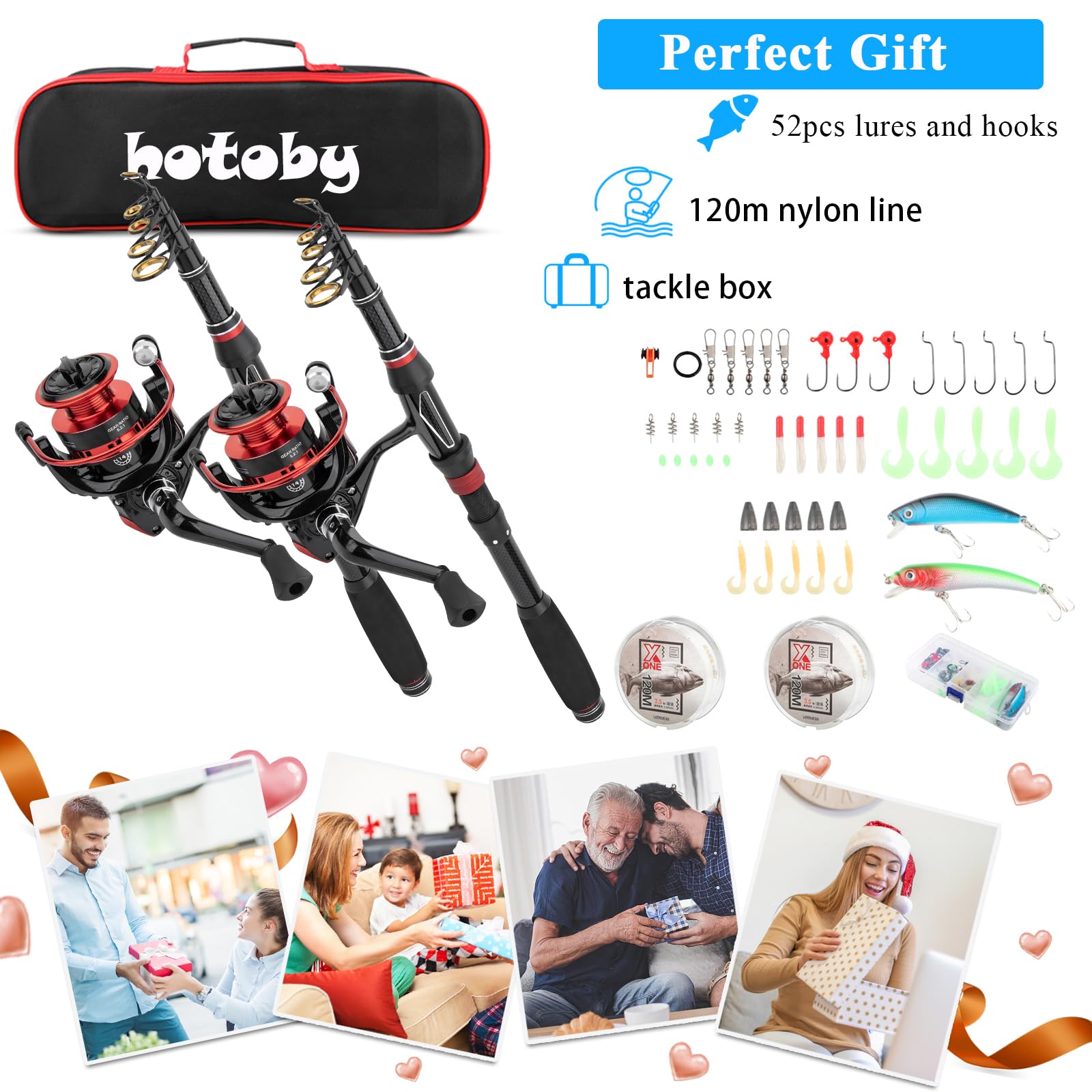 - š[2 PACK Full kit that you can enjoy fishing with partner]-2Pcs Carbon rod + 2Pcs spinning reel + 2Pcs fishing line + 52pcs accessories + Carrier bag, so you can not only enjoy the fun of fishing by yourself, but also share it with family, friends and partners. And you can start fishing immediately With this set, there is no need for you to buy any other fishing stuff. Not only for dab hand but also for beginners!