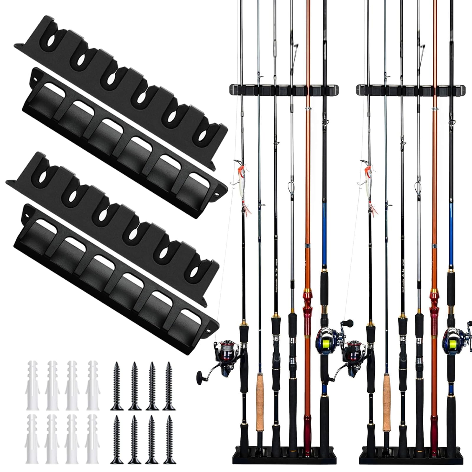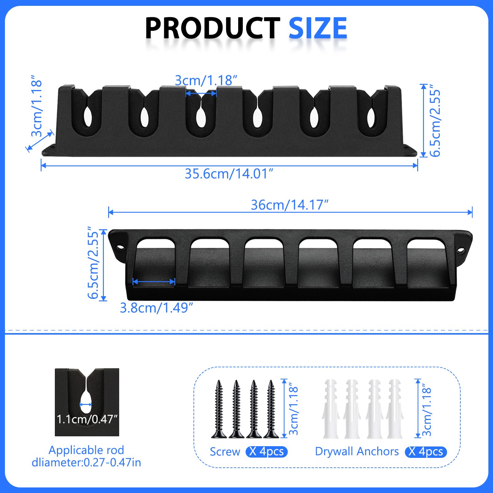 - 【Maximum Storage Capacity】The fishing rod holders are 14.01 inches long and 2.55 inches wide and store neatly and securely in vertical wall space, it can hold up to 12 fishing rods and fit most rod sizes. You can also adjust the distance between the two rod holders as needed
