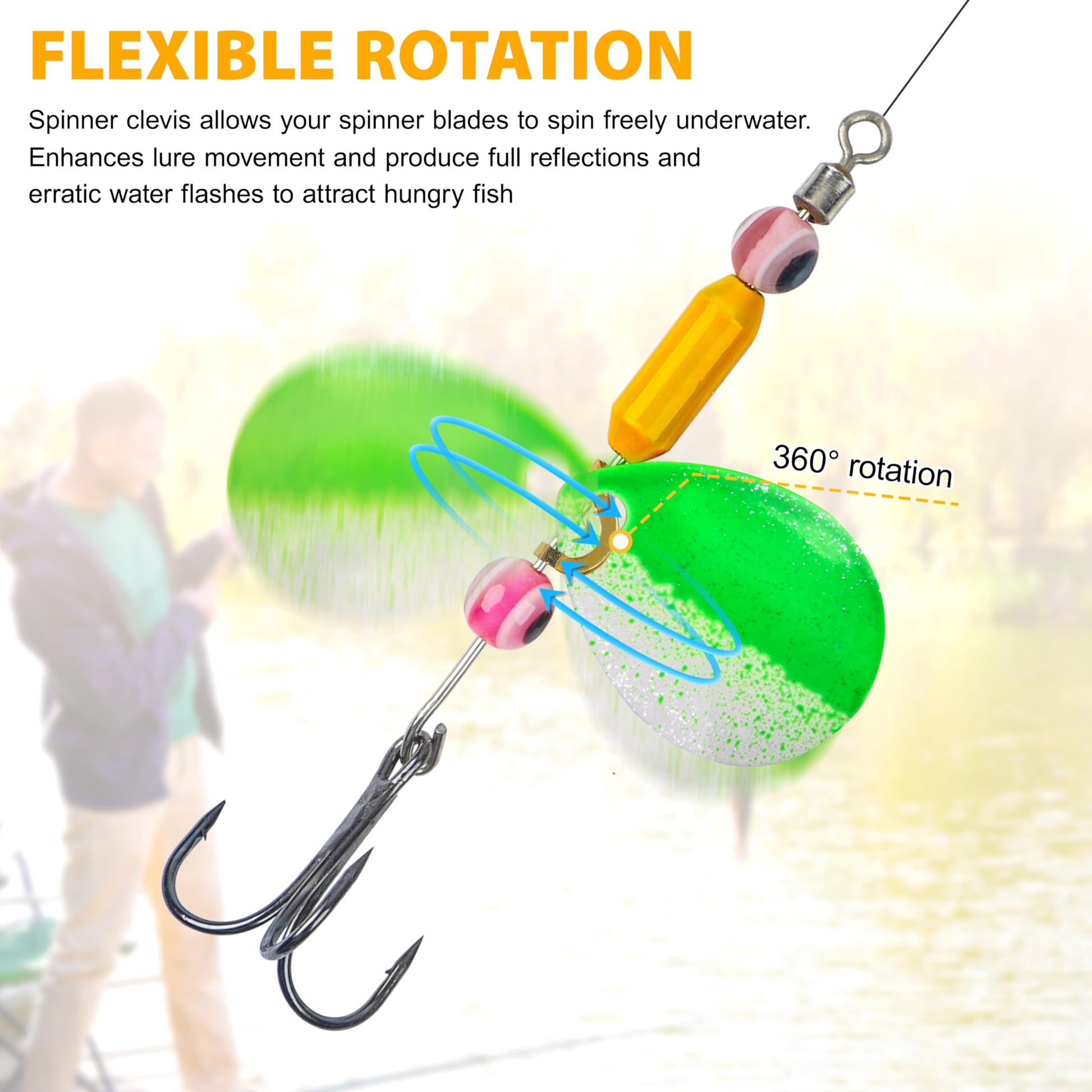 - SPINS FREELY: Quick change spinner clevis allows your spinner blades to spin freely underwater and won't damage your line. Fishing clevis enhances lure movement and produce full reflections and erratic water flashes to attract hungry fish.