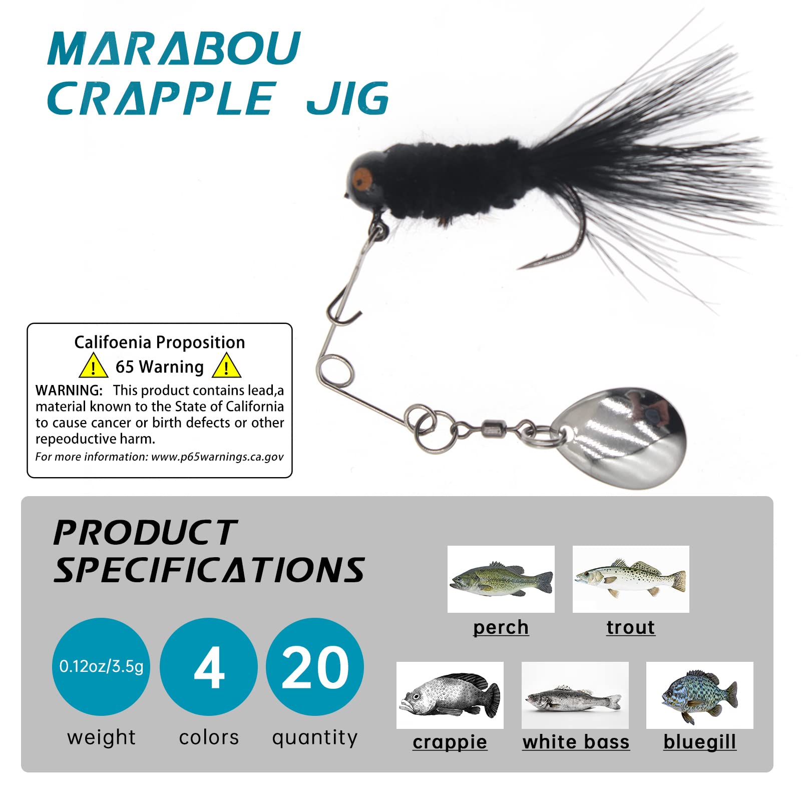 FishingPepo 20 Pcs Fishing Jig Marabou 1/8oz Feather Crappie Jig Heads with Spinner Blades Baits jiging Lures Lead Head Fishing Jig Hooks for Walleye Bass Fishing Accessories