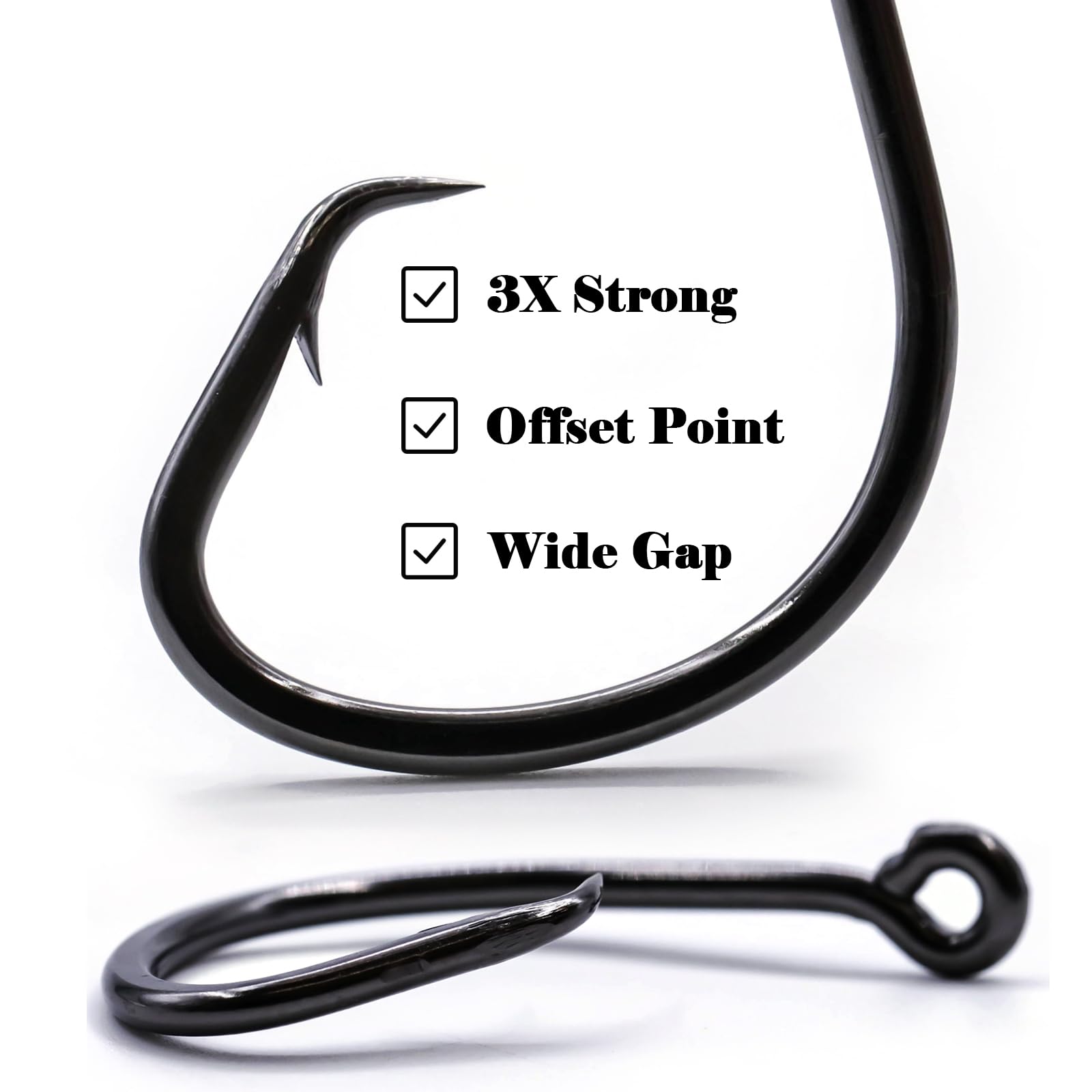 - [Offset & barbed design] The offset Circle hooks increases the hookup ratio, preventing big fish from escaping. The wide gap design allows for easy hooking of live bait and cutting bait,making it suitable for various fishing techniques