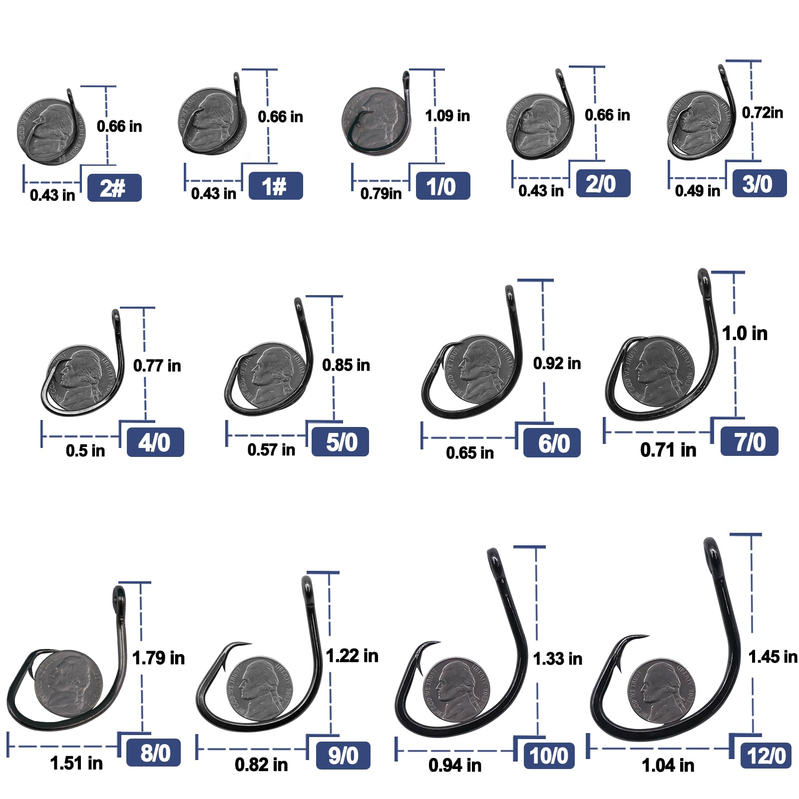 - [Multiple sizes] Including Size #2,#1,1/0,2/0,3/0,4/0,5/0,6/0,7/0,8/0,9/0,10/0,12/0.Please check the size chart before purchasing to ensure you purchase the correct size.Circle fishing hooks can be used to catch a variety of fish.Such as catfish,bass,trout,salmon,bluegill,stripers,walleyes,big crappie,etc.