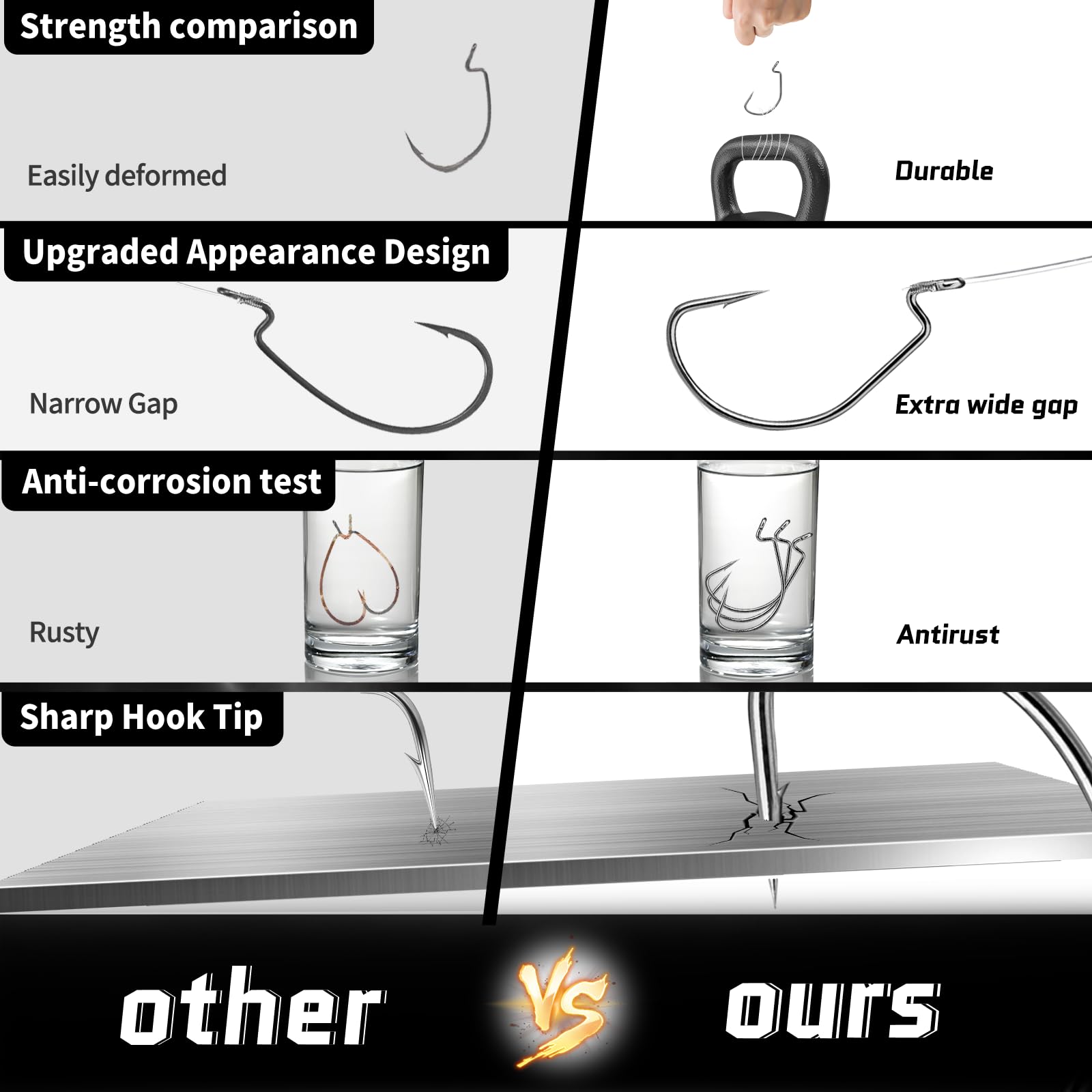 - The hooks are strong, durable, and reliable in both freshwater,saltwater and bass fishing environments, making them an essential addition to any angler's tackle box.