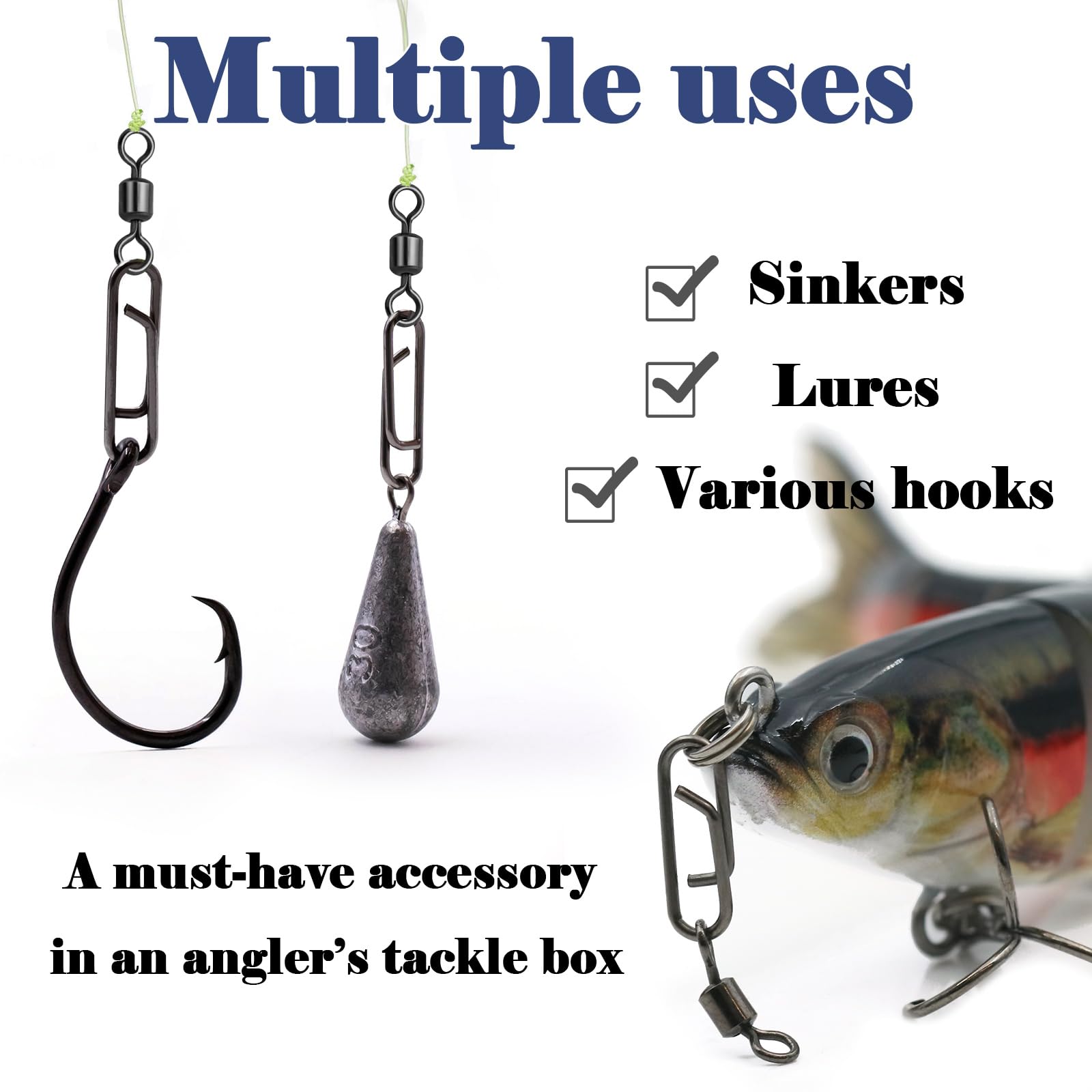 - [Must have for angler's tackle box] It eliminates the trouble of re -tied the fish line and fishing line entanglement. Usually used at the end of the fish line to connect to any rigs,fishing hooks,leaders,weights and fishing lures.