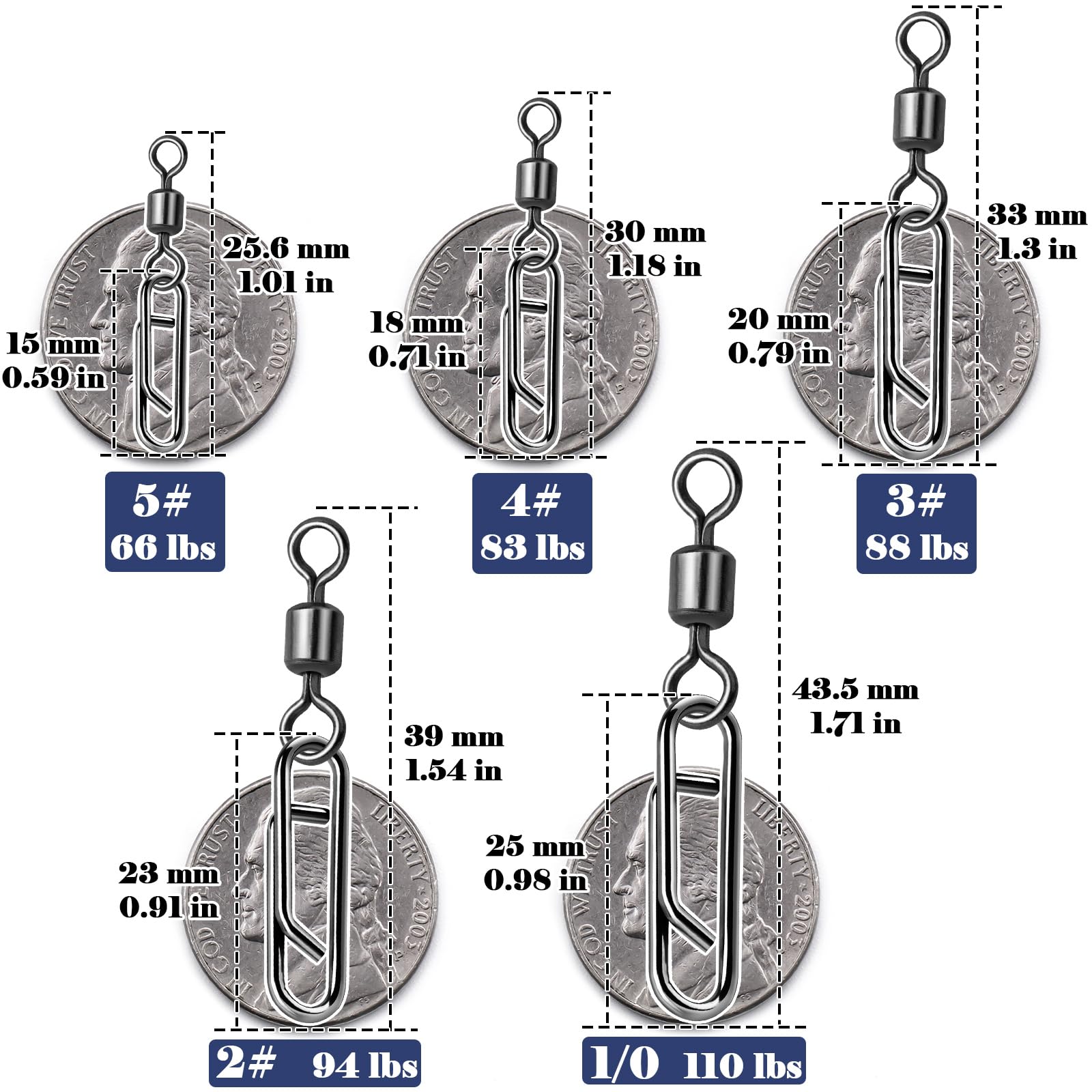 - [Multiple Sizes] Five sizes are suitable for use not only in fresh water but also in salt water.Fishing clips can be used for different fishing scenarios such as Baitcasting Fishing, Spining Fishing, Surf Fishing.
