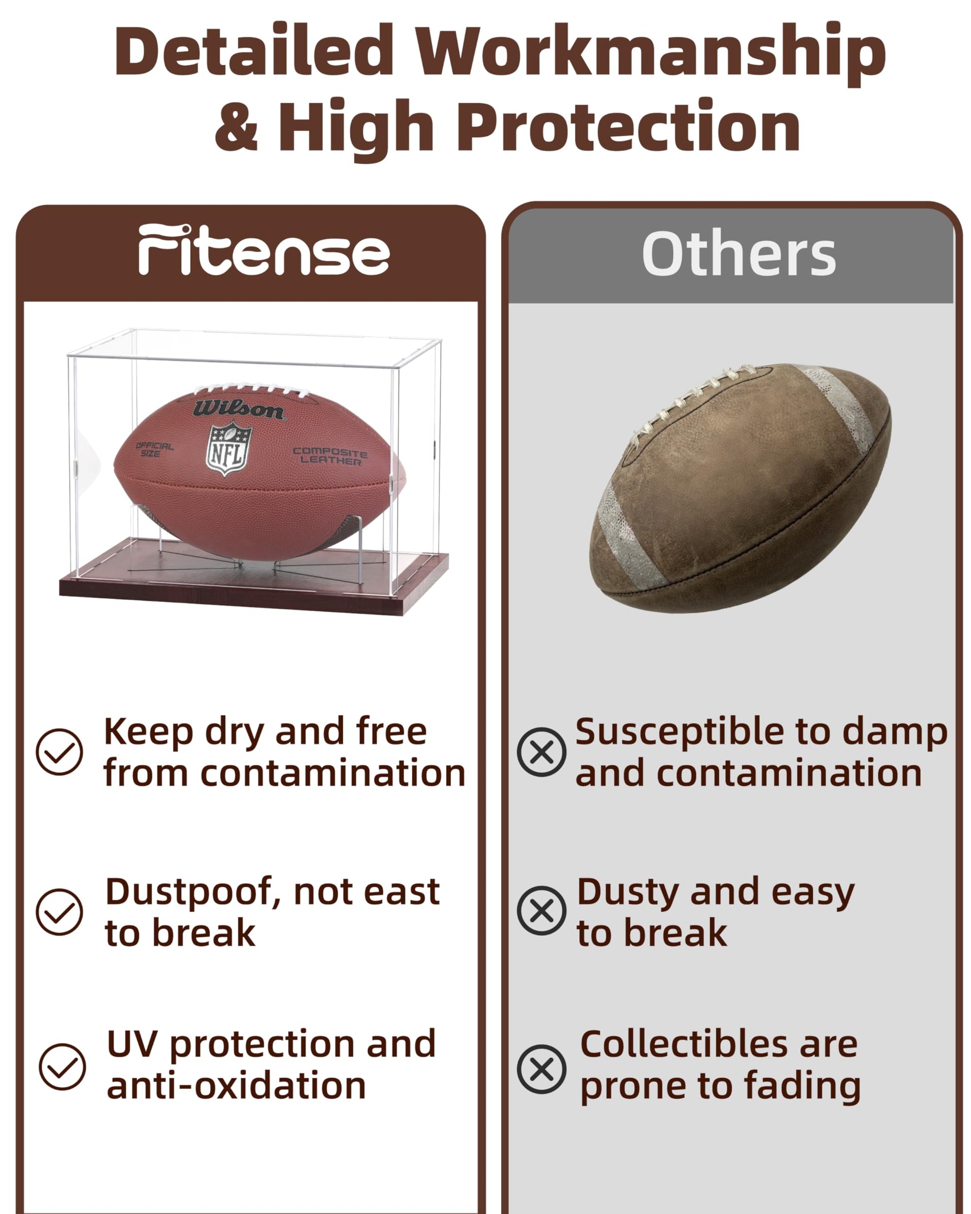 - Hassle-Free Assembly & Innovative Design: Experience the convenience of Fitense football display case, ingeniously crafted for easy setup and interaction. Features traditional mortise and tenon joints for stability and durability, no nails or glue needed to quickly assemble the acrylic box. Just 1 Minute, all done! PS: Before assembly, please remove the protective film from the acrylic border