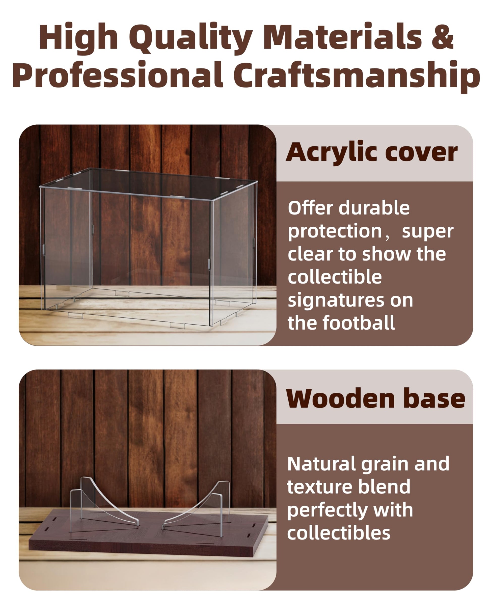 - High-Quality Materials & UV Protection: Our football case display clear is made of thick acrylic materials that prevented your football from dust and UV rays, keeping fading and maintaining its pristine condition. The signature on the football is super clear and ensures an unobstructed view! The natural grain & texture of the solid wood base blends perfectly with your cherished memorabilia