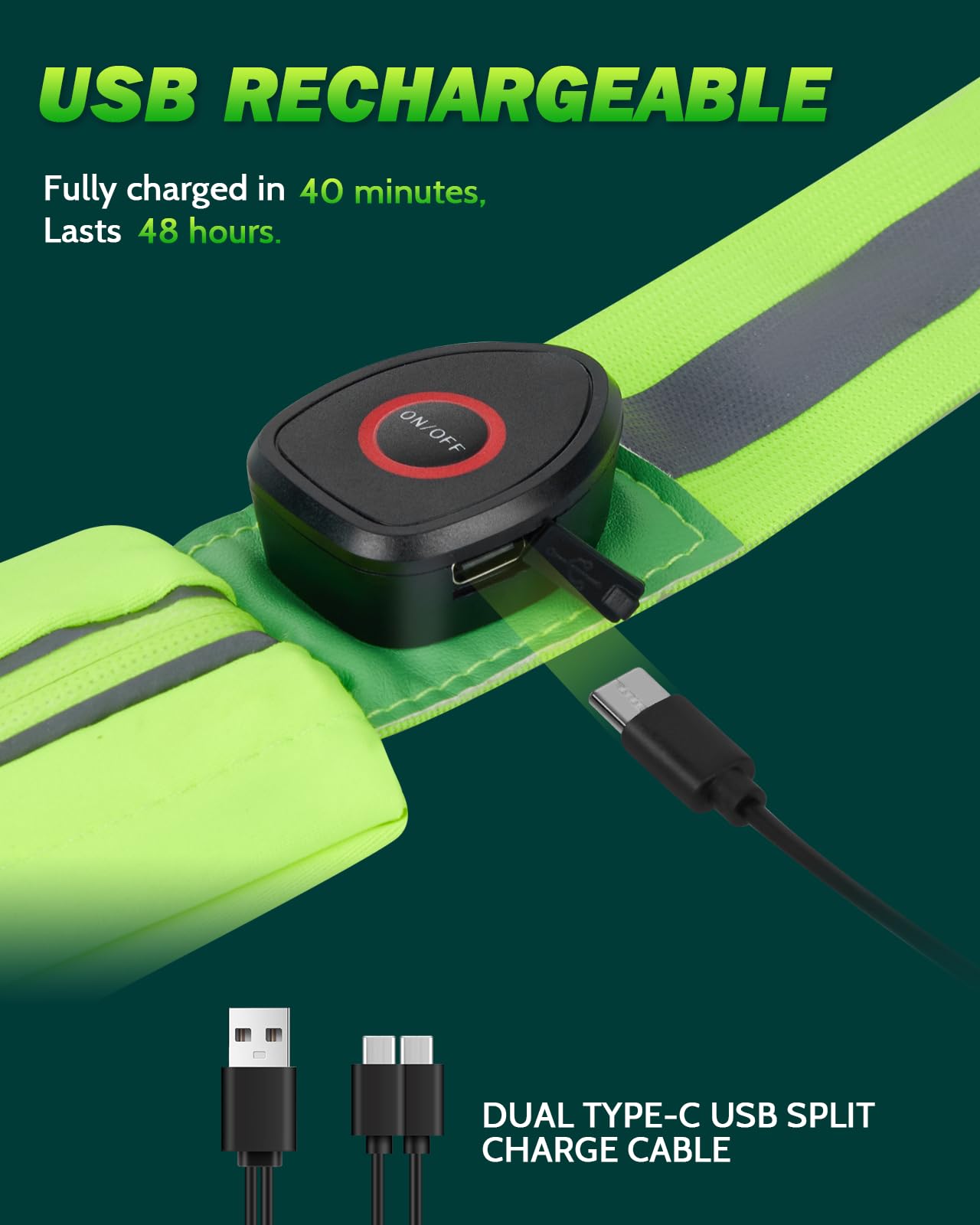 - Dual Switch Control & 3 Light Modes: Featuring separate switches for front and rear green lights, this light up running gear allows you to customize your visibility. Choose from 3 light modes: Fast Flash, Slow Flash, and Steady Light to meet your various needs, whether you're running, walking, jogging or cycling